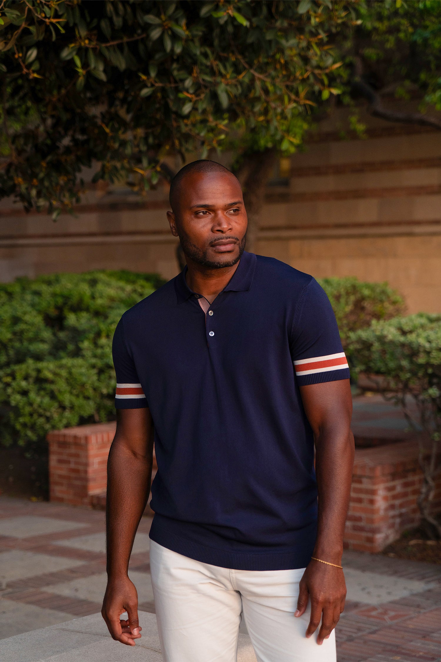 A modern take on a timeless silhouette, the Stripe Polo blends effortless style with refined comfort. Crafted from a breathable cotton-rayon knit, this polo features a smooth, lightweight feel perfect for any season. The standout striped detailing on the sleeves adds a vintage sport-inspired touch, while the tailored fit keeps things sharp and elevated. Pair it with tailored trousers or relaxed denim for a versatile look that moves from day to night with ease.