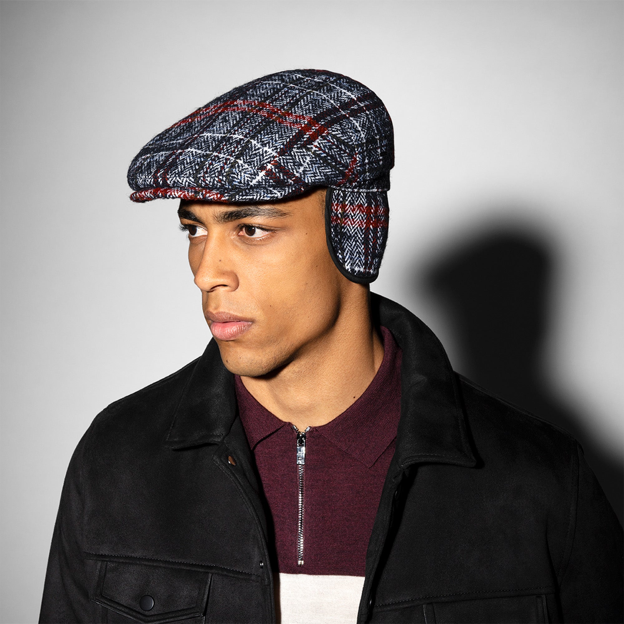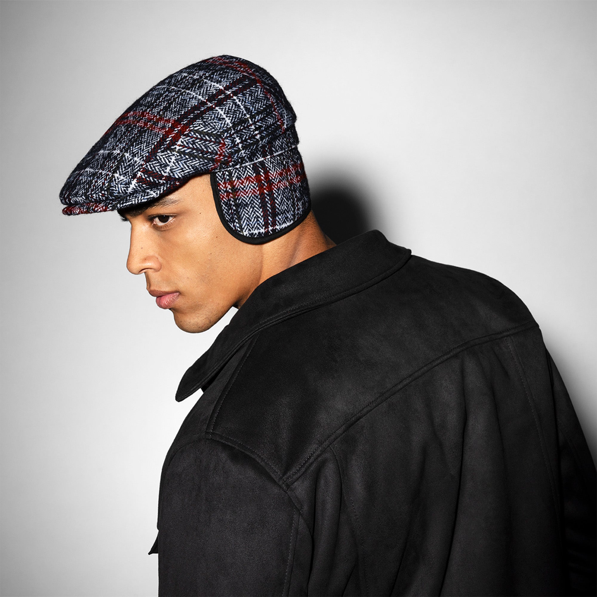 Wool-poly blend in bold plaid with convertible earflaps for warmth
