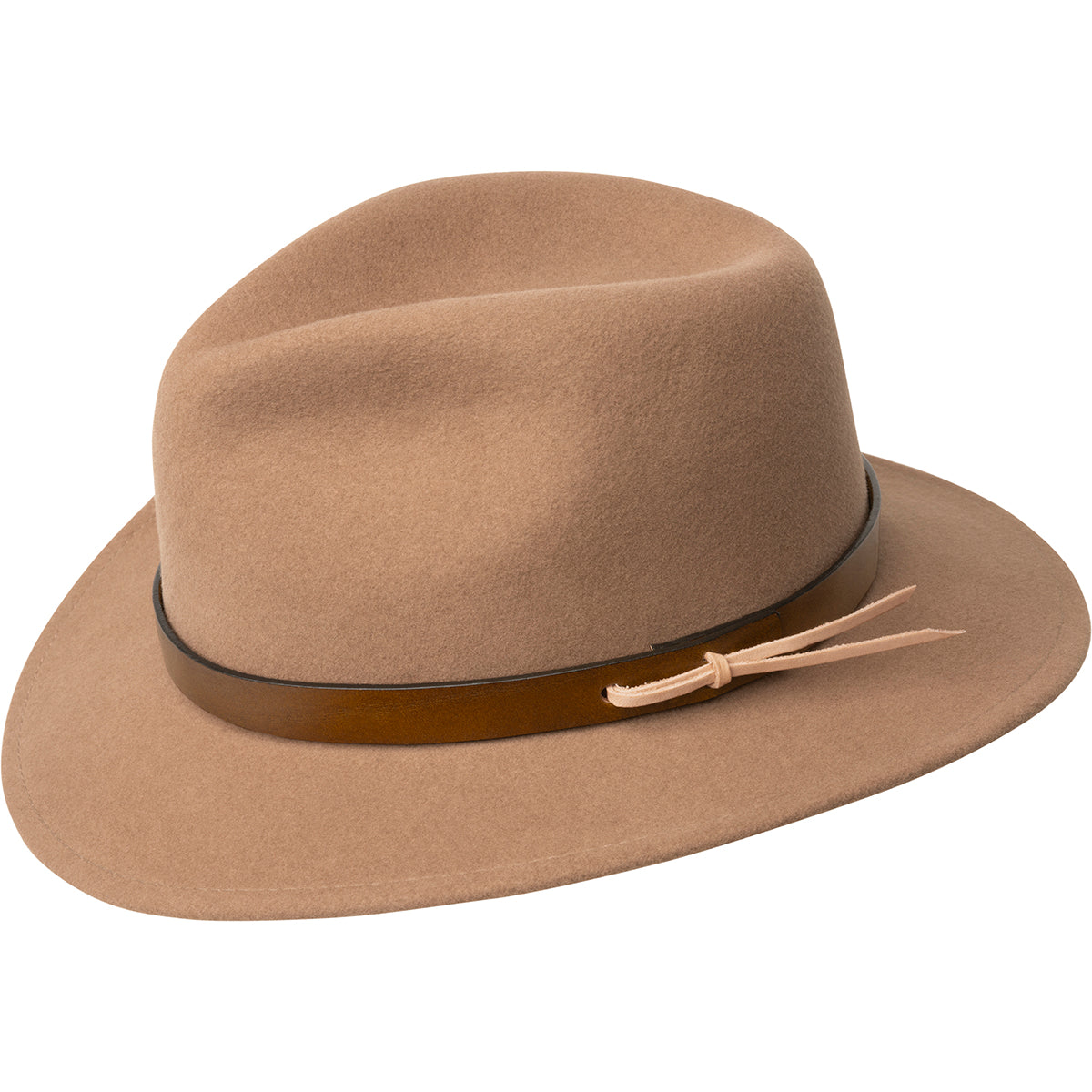 The Lionel by Bailey 1922 is a sophisticated felt fedora crafted from Merino wool treated with LiteFelt庐, making it water-repellent, shape-retentive, and ideal for year-round wear. With its 4" low-profile pinch front crown and 2 1/2" brim, the Lionel delivers a sleek silhouette with rugged elegance. A wide leather band, finished with a vegetable-tanned leather accent, adds refined detail, while a Comfort Sweatband ensures a secure, comfortable fit.