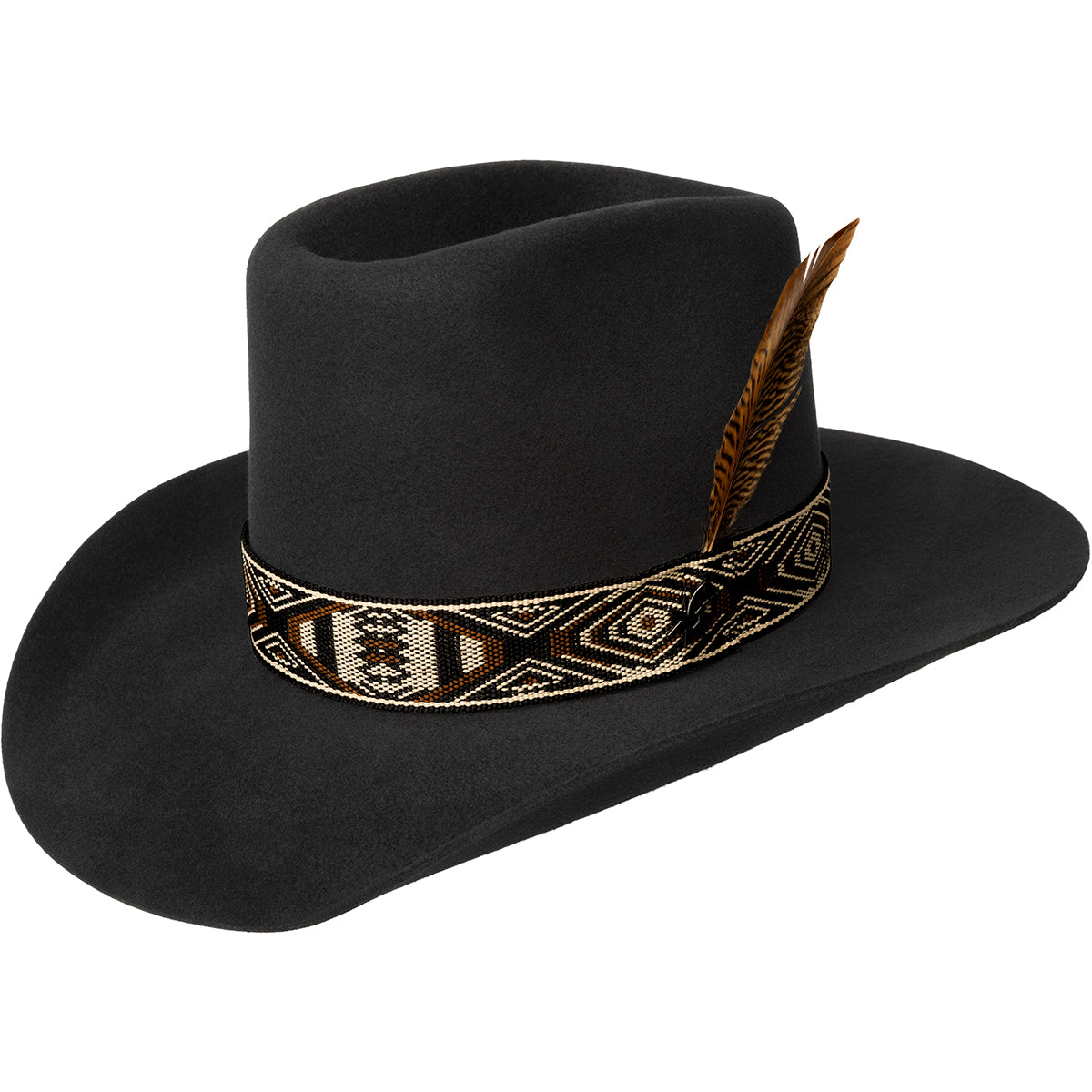 Make a bold Western statement with the Nu Aztec by Bailey Western. Featuring a tall Brick crown and a 3 3/4" brim, this standout cowboy hat blends classic Western structure with rich Southwestern detailing. It��s trimmed with a woven Aztec-patterned hat band and a removable feather for added character. Crafted from durable wool felt, the Nu Aztec is fully lined and finished with a premium leather sweatband for lasting comfort. Proudly made in the USA with authentic Western craftsmanship.