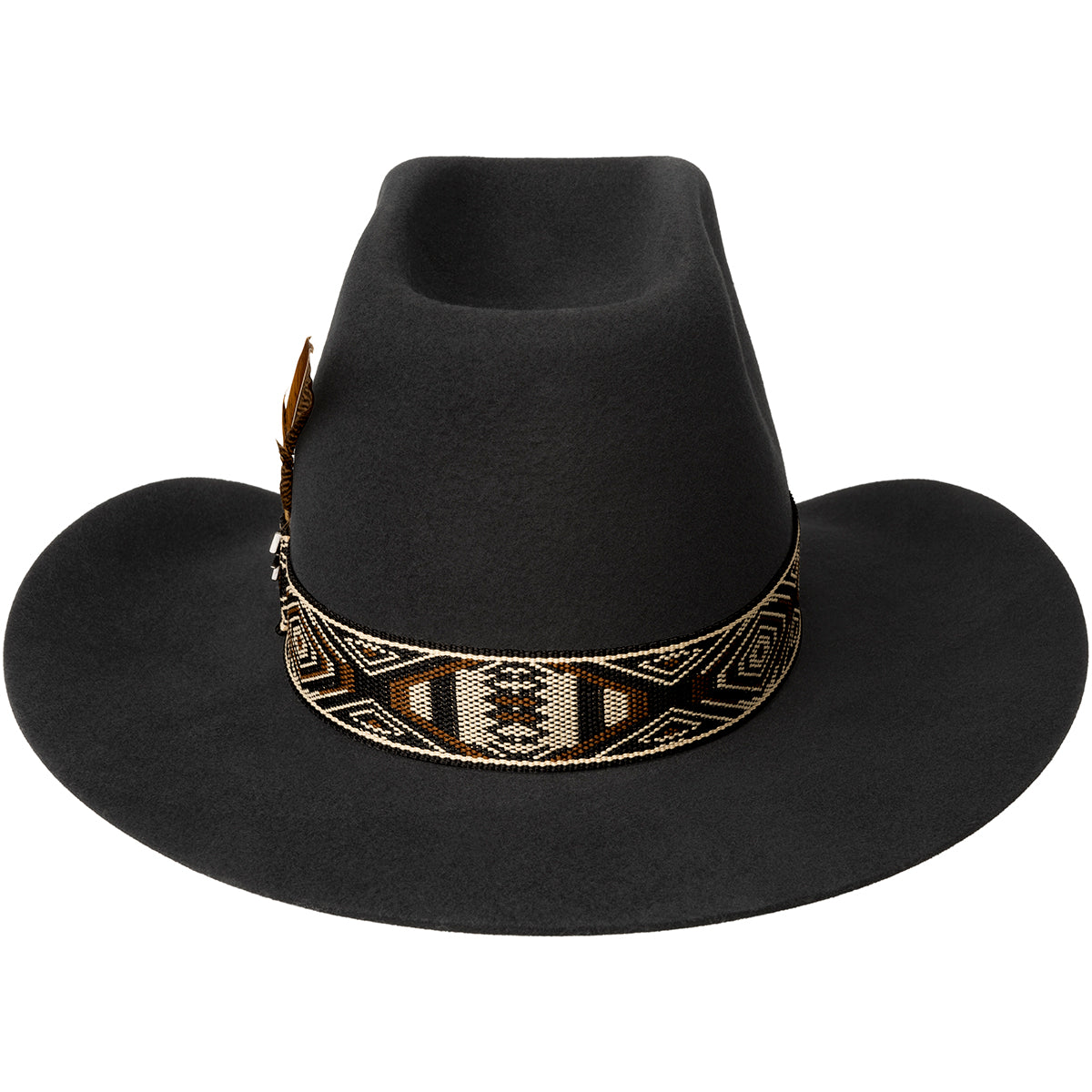 Trimmed with an Aztec-inspired woven band and removable feather accent