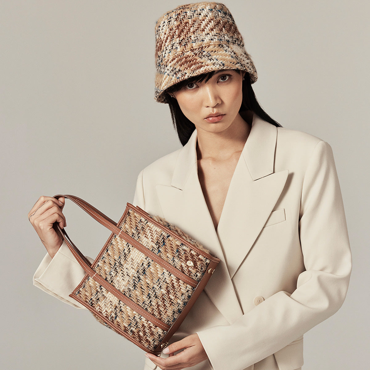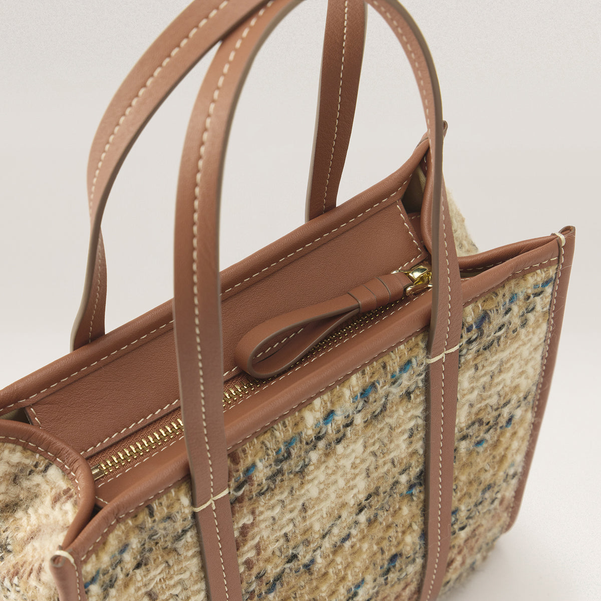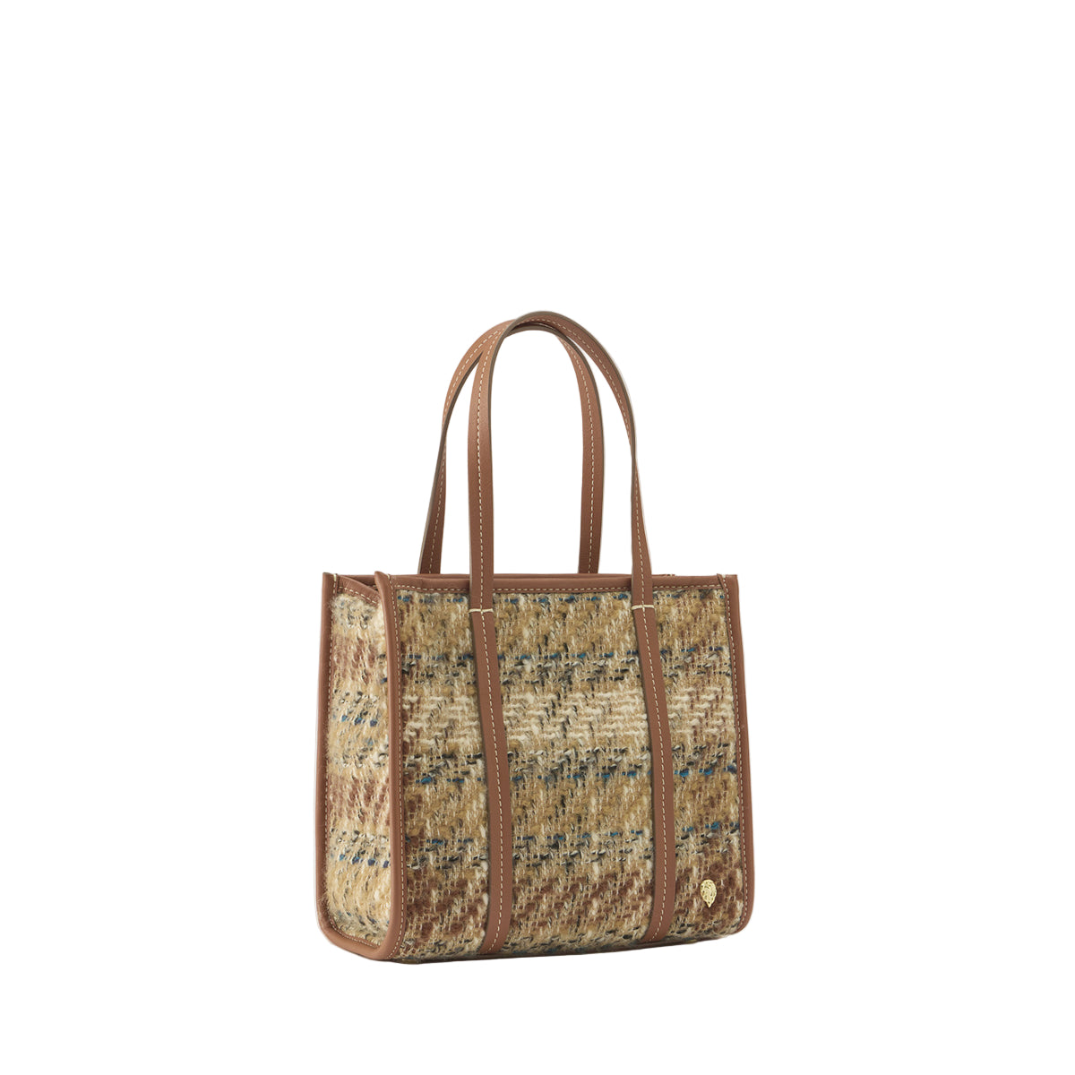 A modern companion, the Arleth Mini Tote by Helen Kaminski blends textured Italian wool with smooth LWG-certified leather handles. Compact in form and elevated in detail, it features an adjustable strap, signature seed logo, and brushed gold hardware.