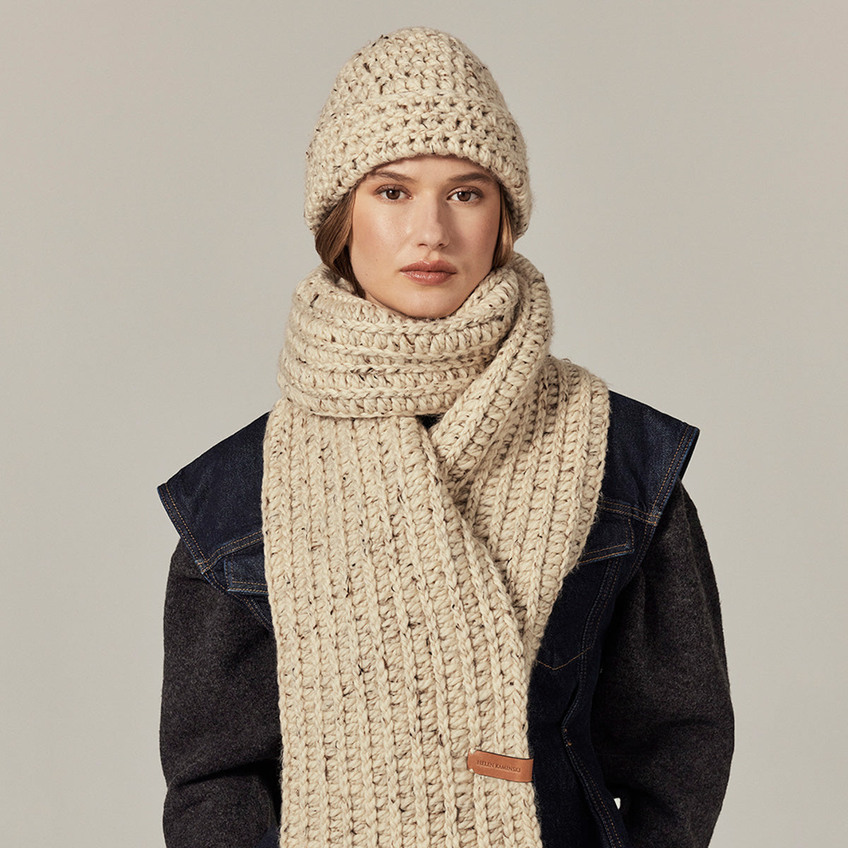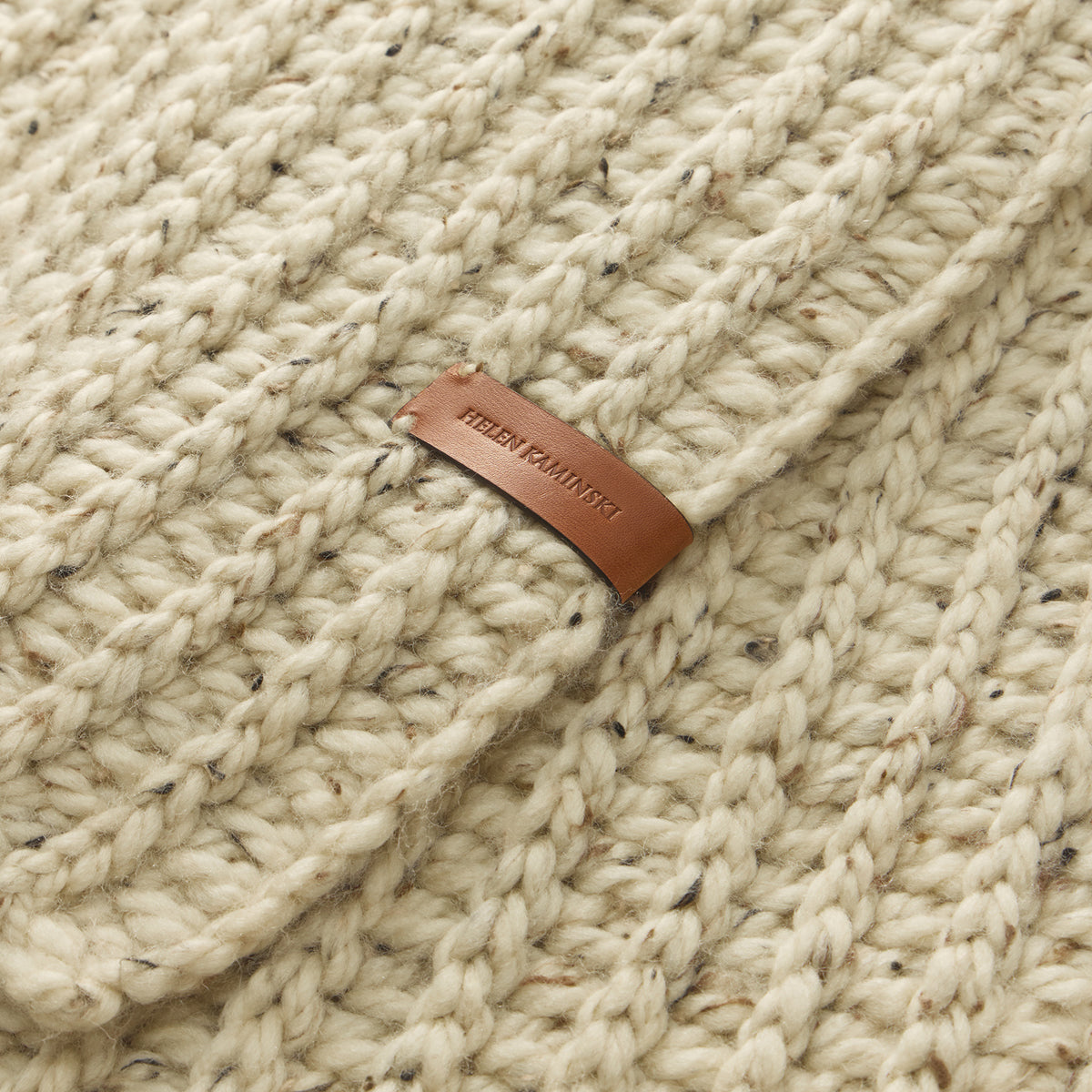 Crafted from a warm wool-blend yarn, the Cove Scarf by Helen Kaminski showcases artisanal crochet in a chunky texture that feels both modern and nostalgic. Finished with a Vachetta leather logo tab and designed to be packable, it's a versatile layer for cooler days.