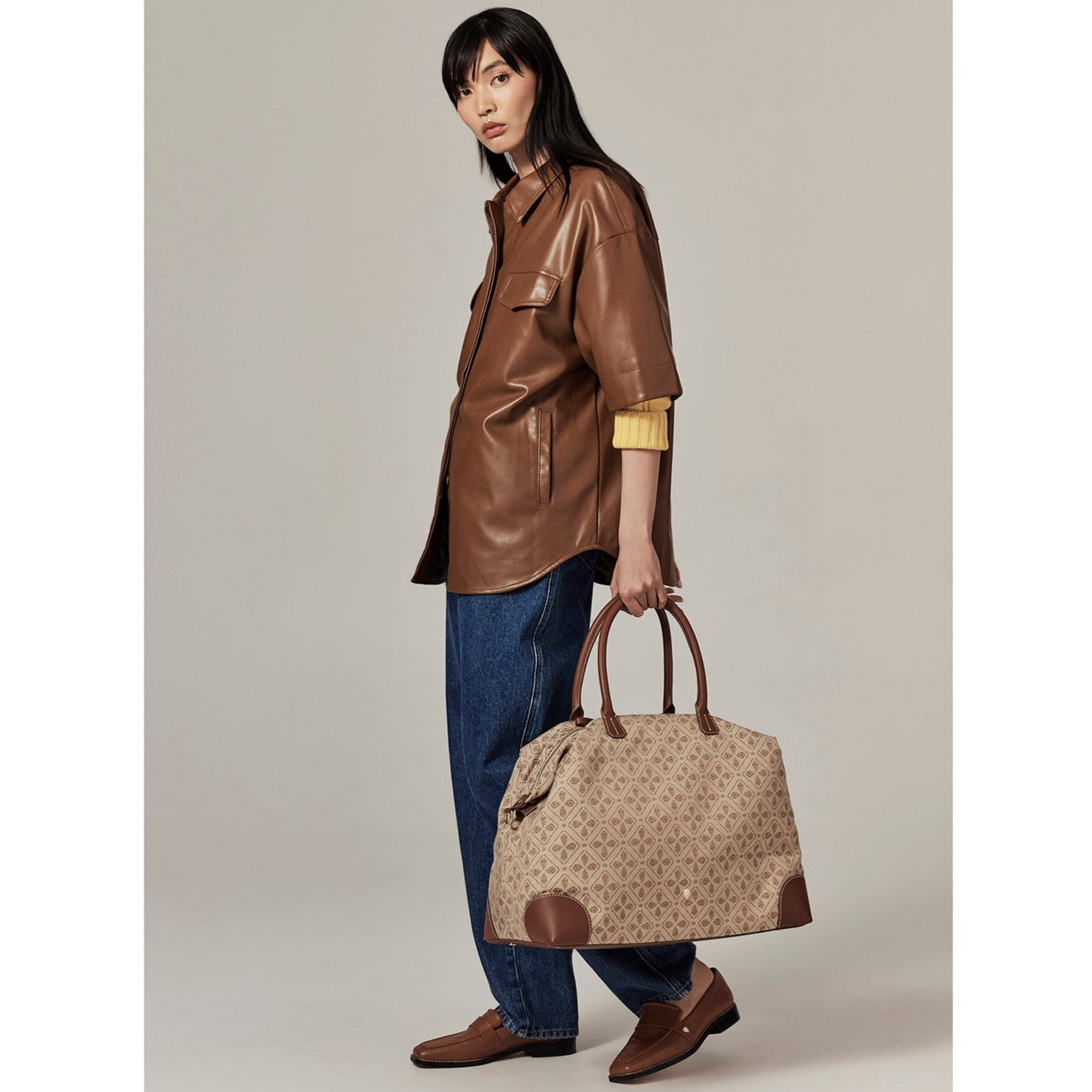 The River Overnighter by Helen Kaminski is designed with travel in mind, featuring a durable jacquard exterior, LWG certified leather trim, and signature seed hardware. A spacious, lined interior with zipped closure keeps essentials secure, while the optional crossbody strap adds hands-free ease for transit.