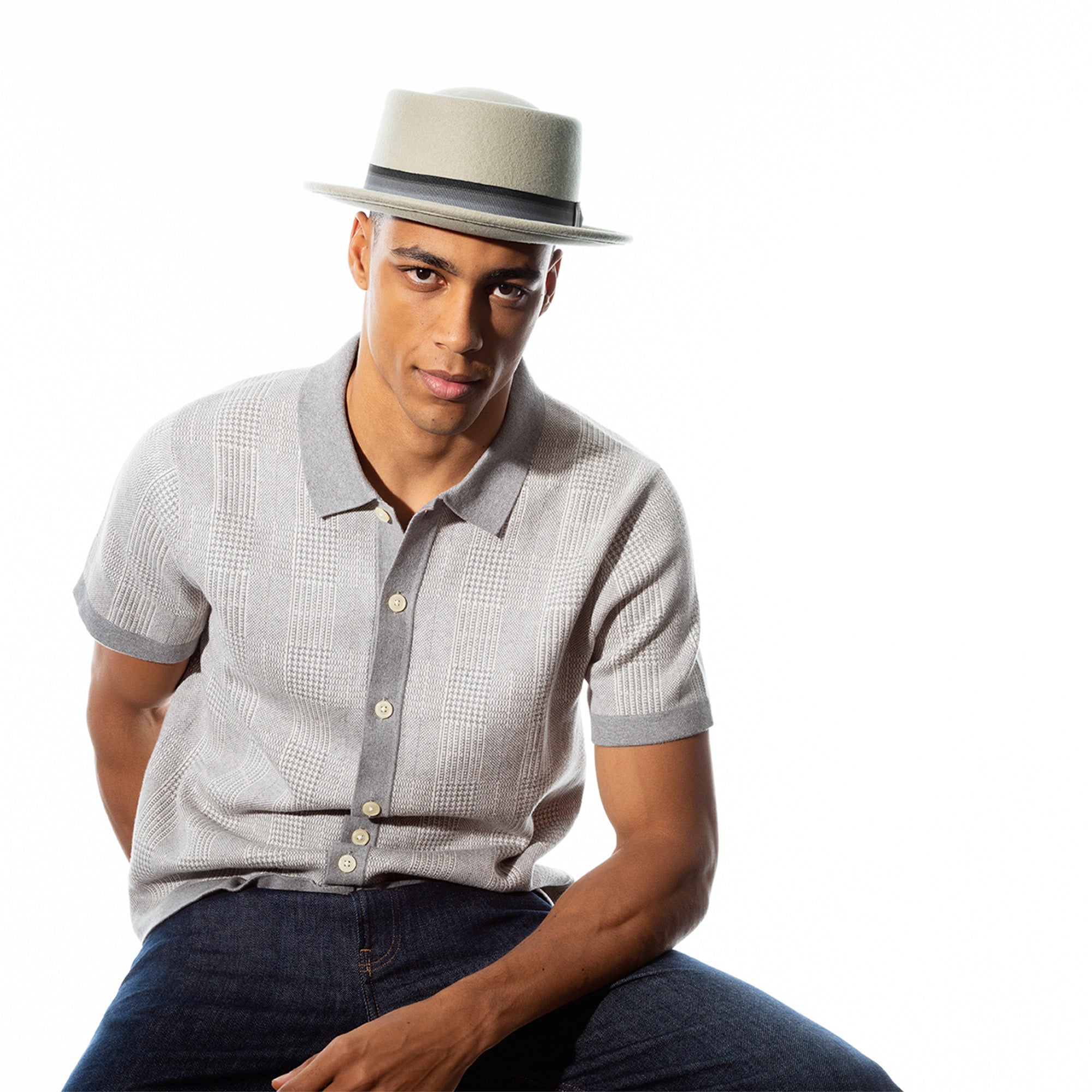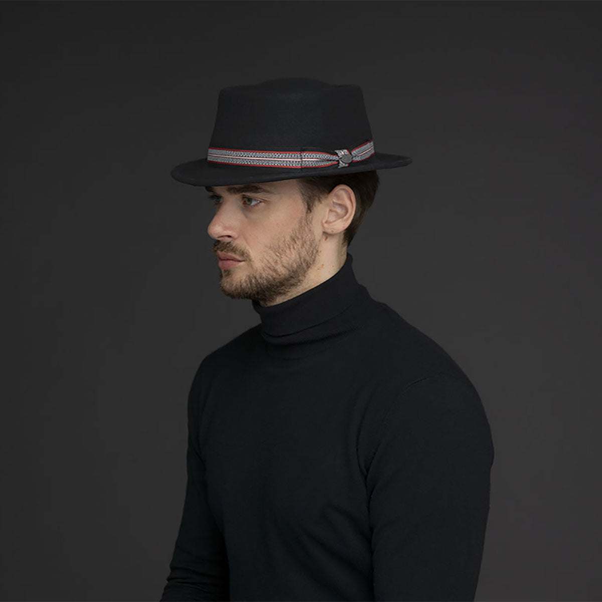 The Klaxon Pork Pie by Bailey 1922 features a 4" telescope crown and a 2" brim. Crafted out of a soft Wool Felt body, this style is finished with a striped grosgrain trim, is fully lined, and has a comfort sweatband to ensure a perfect fit.