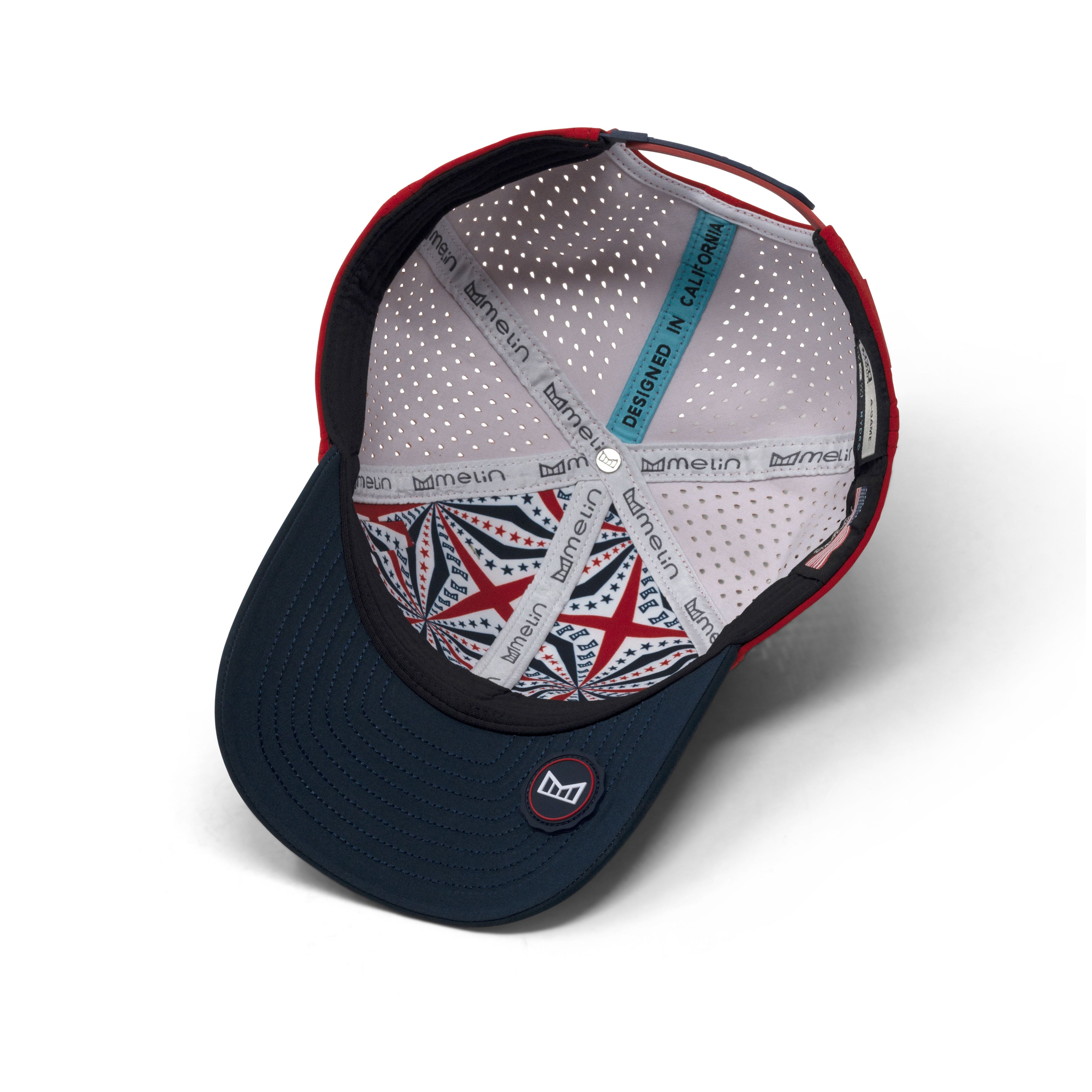 The Hydro A-Game Americana Shield Baseball Cap by Melin in a new, limited-edition colorway, that shows off your red, white and blue spirit.� This classic baseball cap is bright, bold, and will stand out.