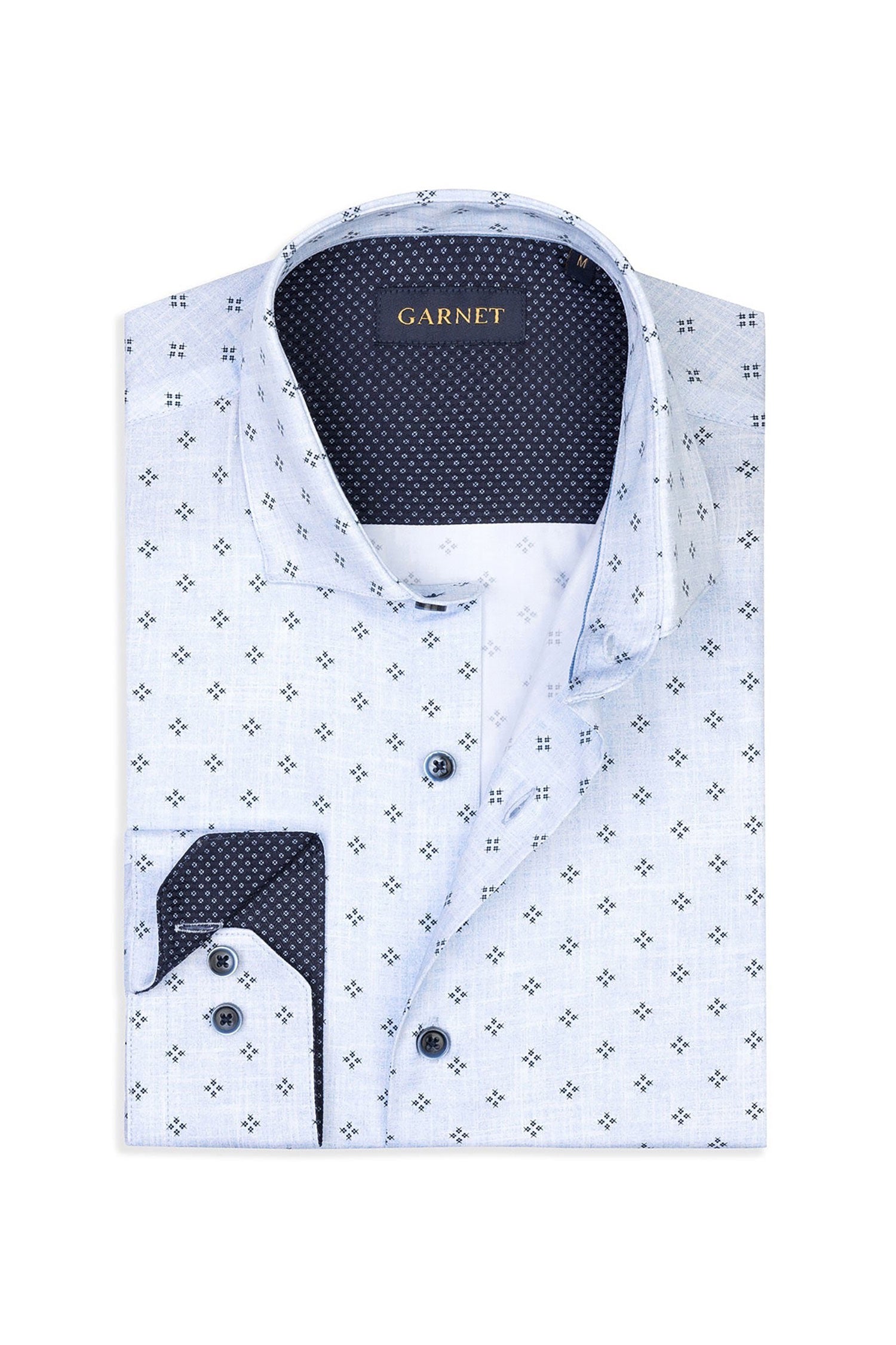 Introducing the Garnet men's diamond printed long sleeve shirt, featuring a sophisticated diamond print on a light blue background. Contrasting navy inner collar and cuffs add contemporary flair. Crafted from high-quality materials for comfort and durability, this versatile shirt is perfect for both professional and casual settings. Elevate your style with this refined piece.