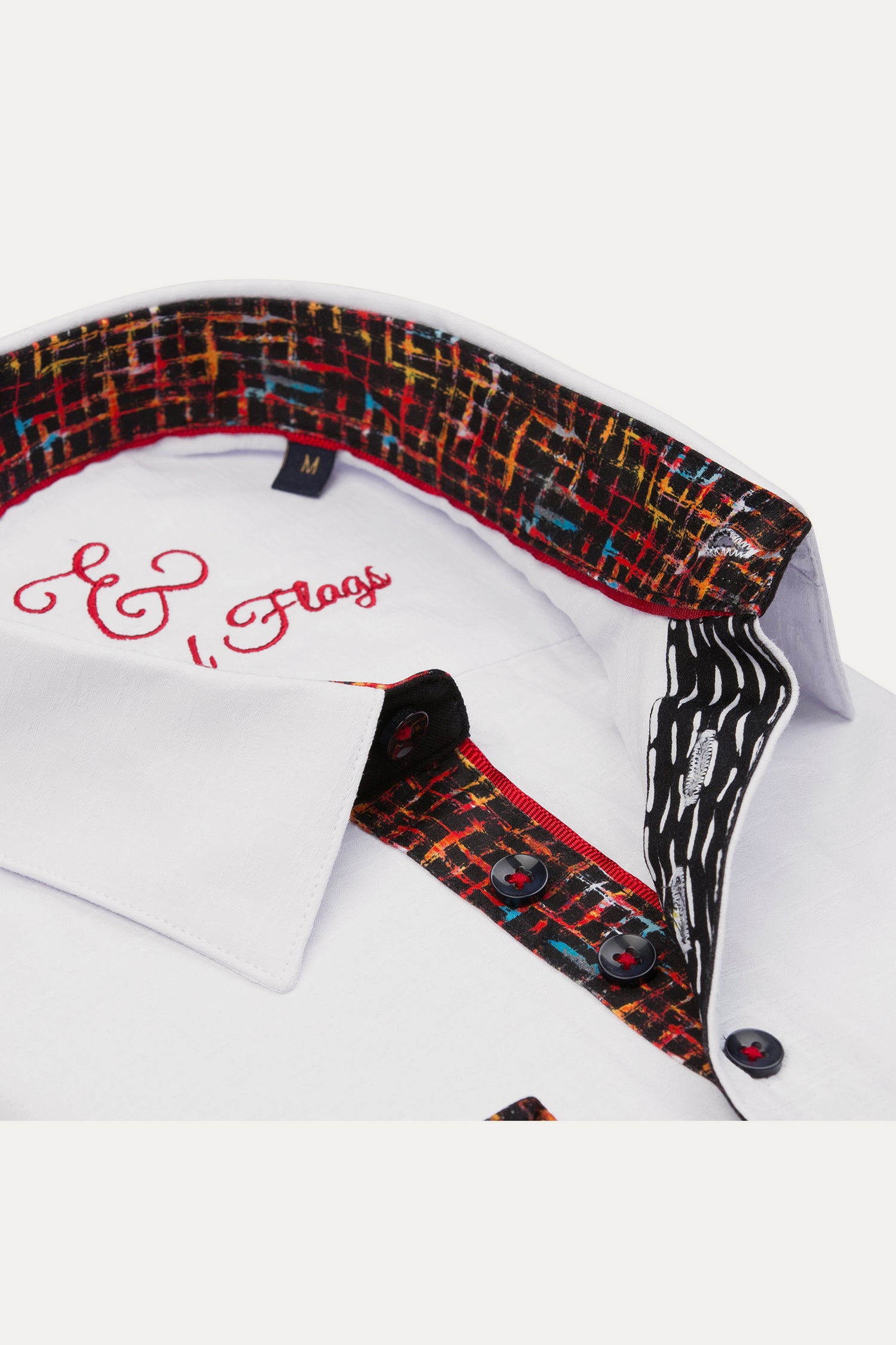 - Contrast inner collar, placket, and cuff design
