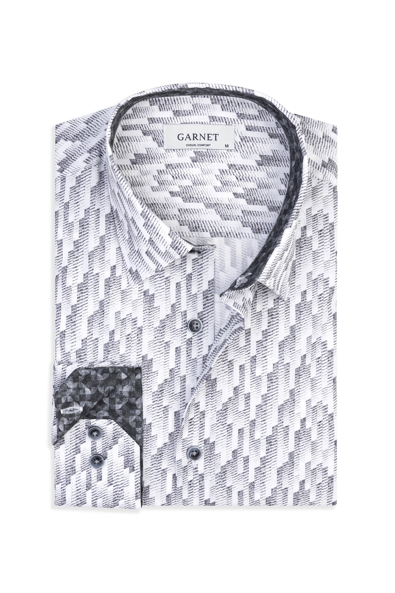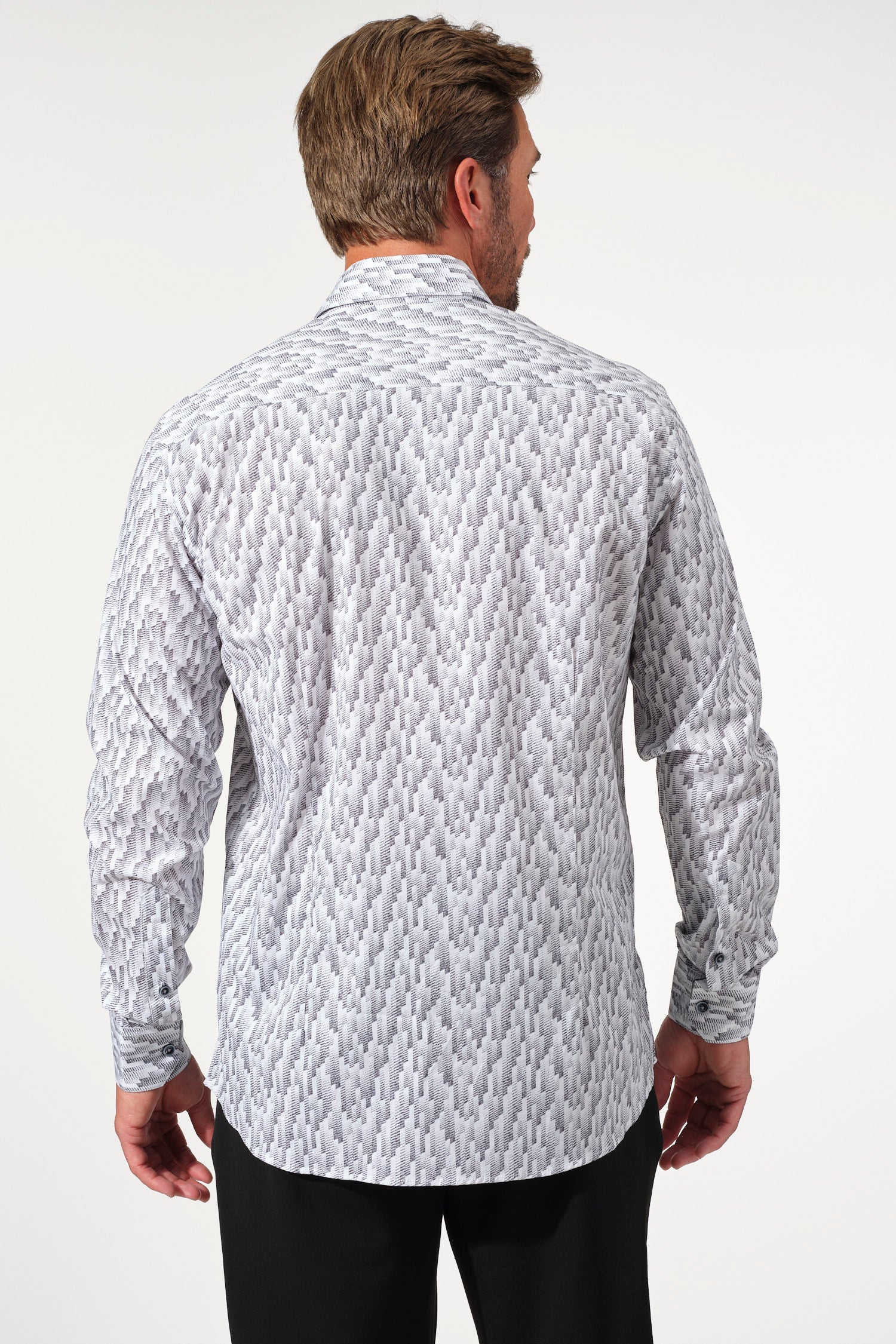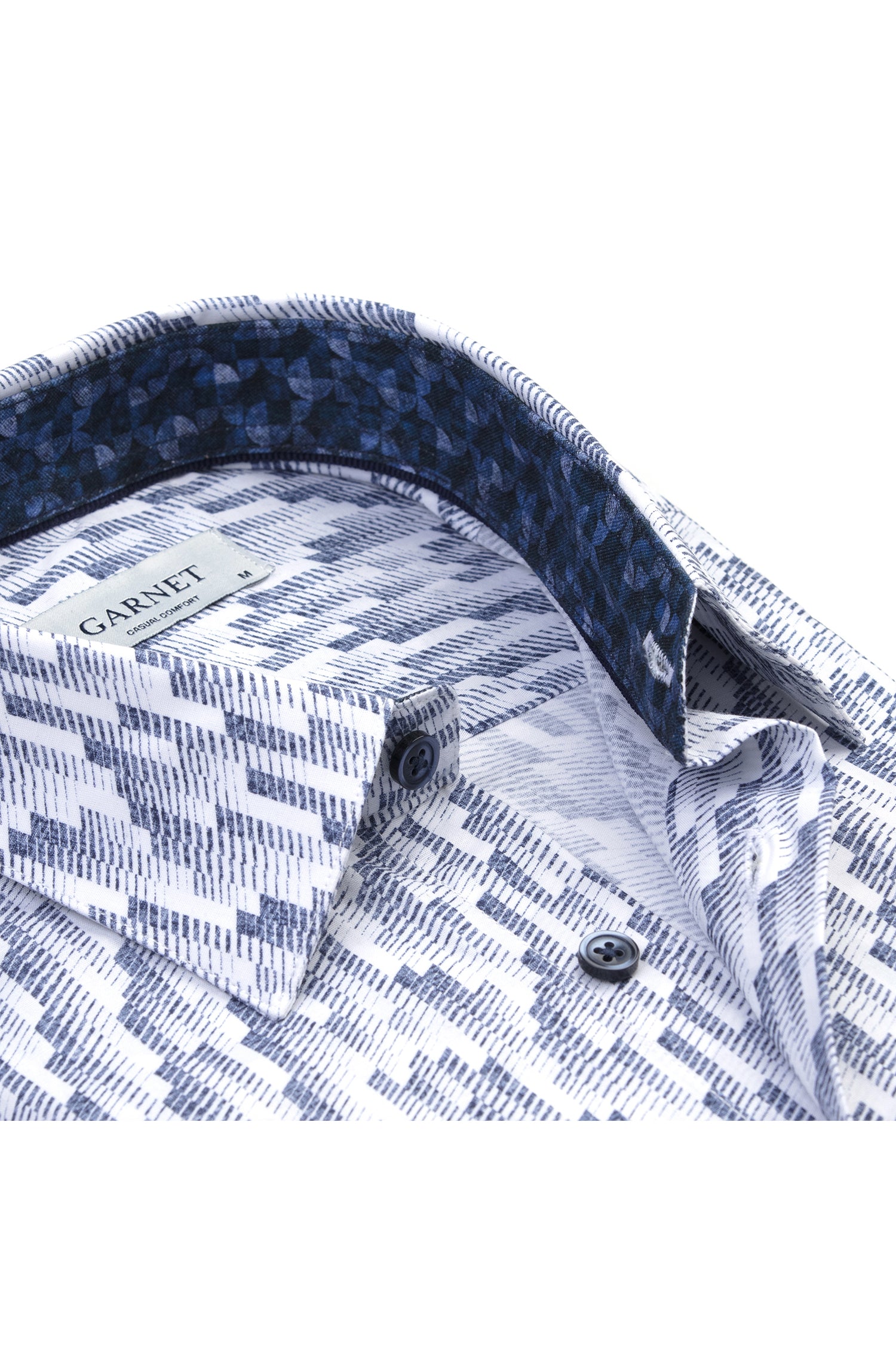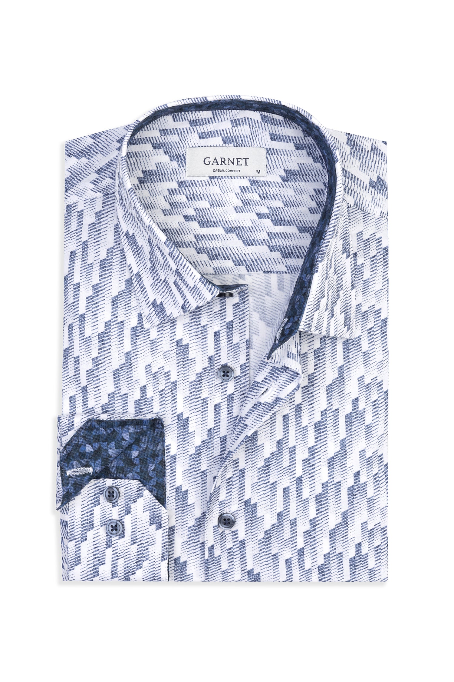 Step up your shirt game with this architectural-inspired pattern featuring a stepped linear design in crisp blue on white. Crafted from a soft stretch-cotton blend, this shirt delivers elevated comfort with subtle contrast accents that peek from the collar and cuffs. It's modern, refined, and ready for anything from workdays to weekends.