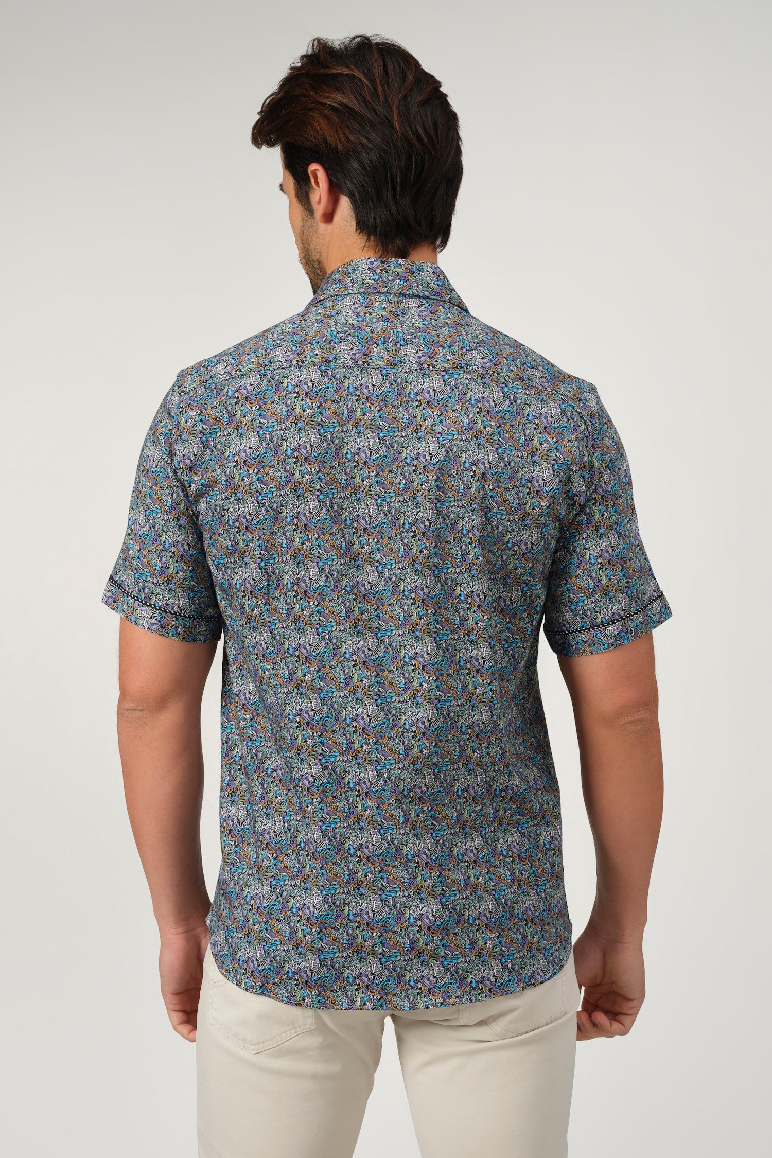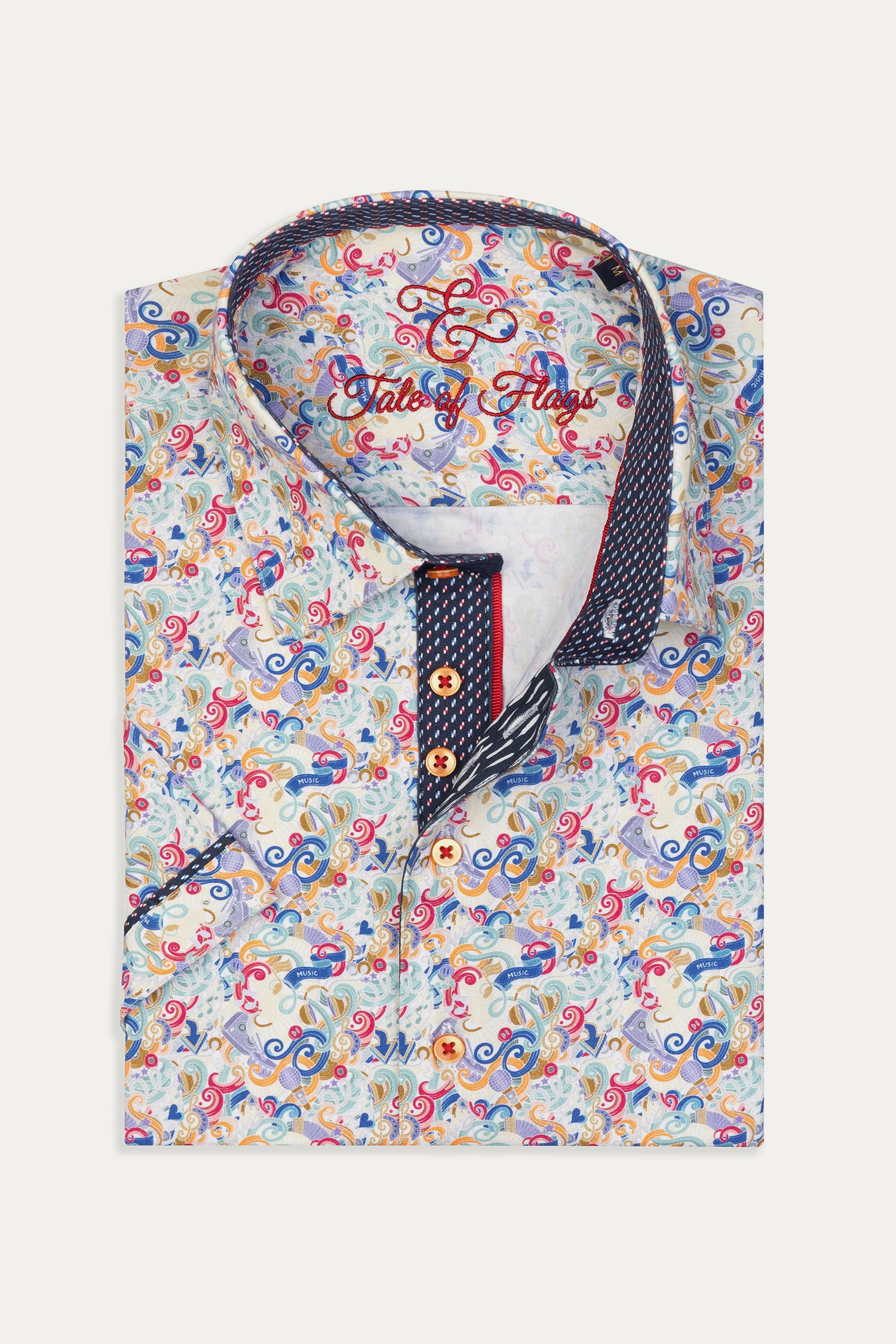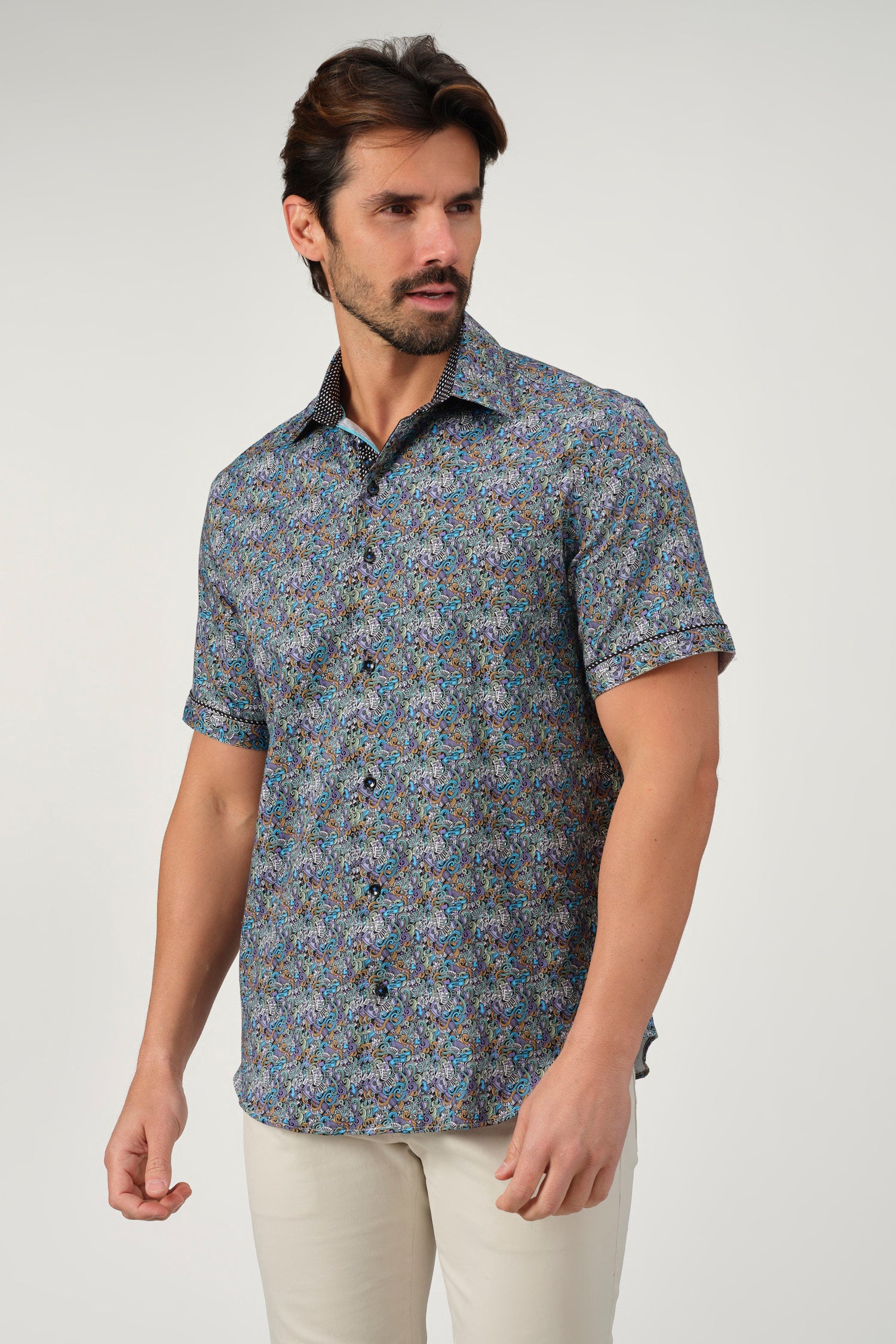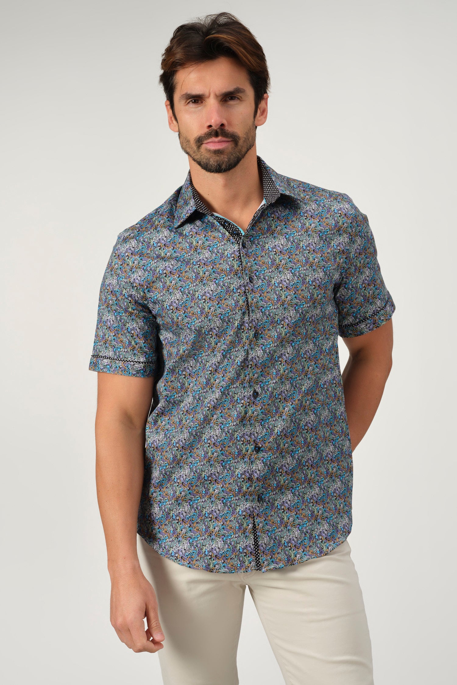 A sophisticated fusion of intricate artistry and modern tailoring, the Baroque Scroll Shirt is a statement piece for the refined wardrobe. Designed with an elaborate scroll pattern in vibrant hues, this short-sleeve button-up is crafted from a soft offering both comfort and slight stretch for ease of movement. The contrasting inner collar and cuff details add an extra layer of elegance, making it perfect for smart-casual occasions.