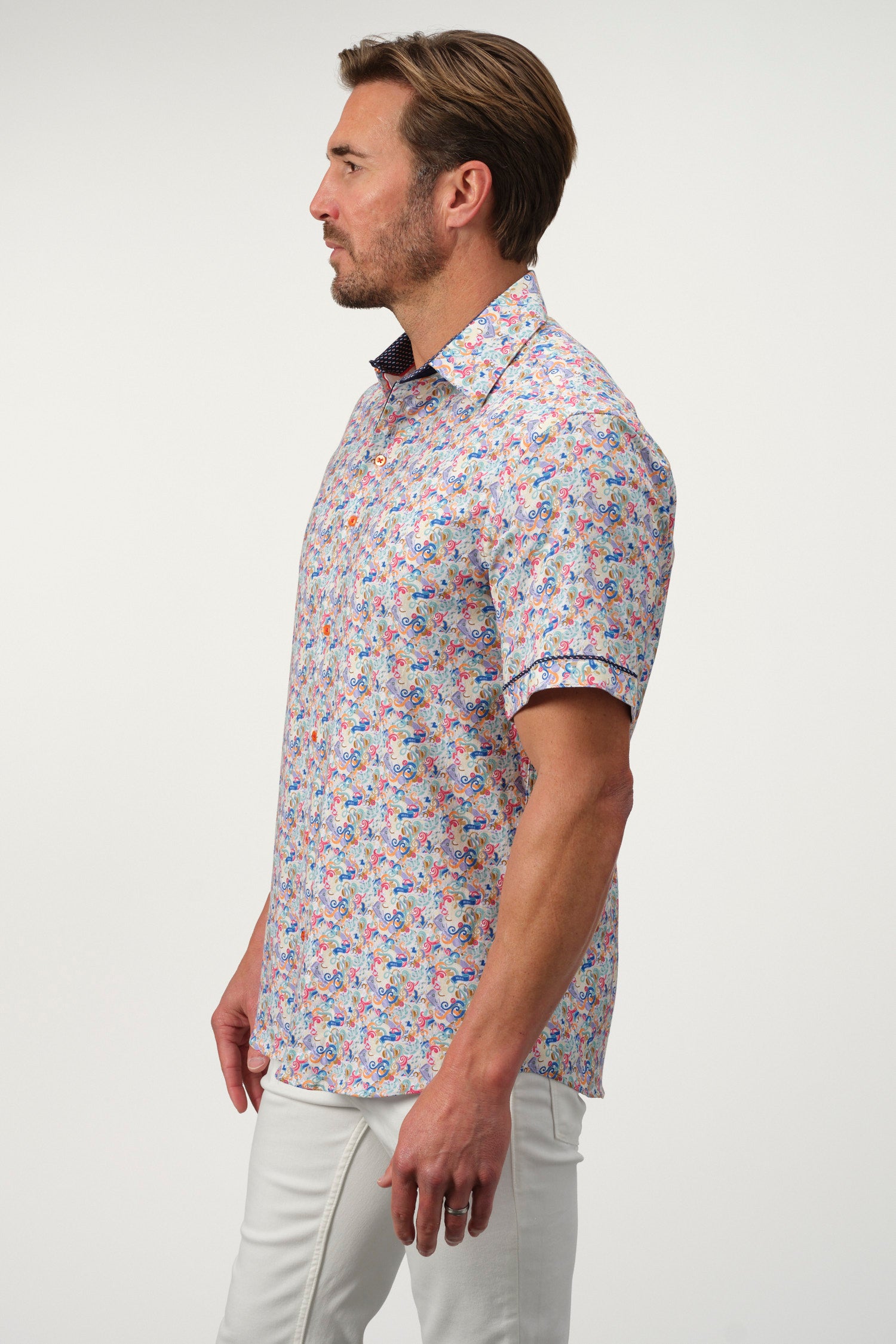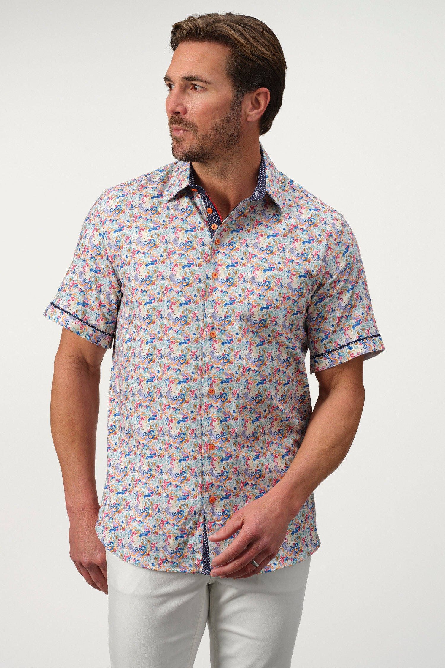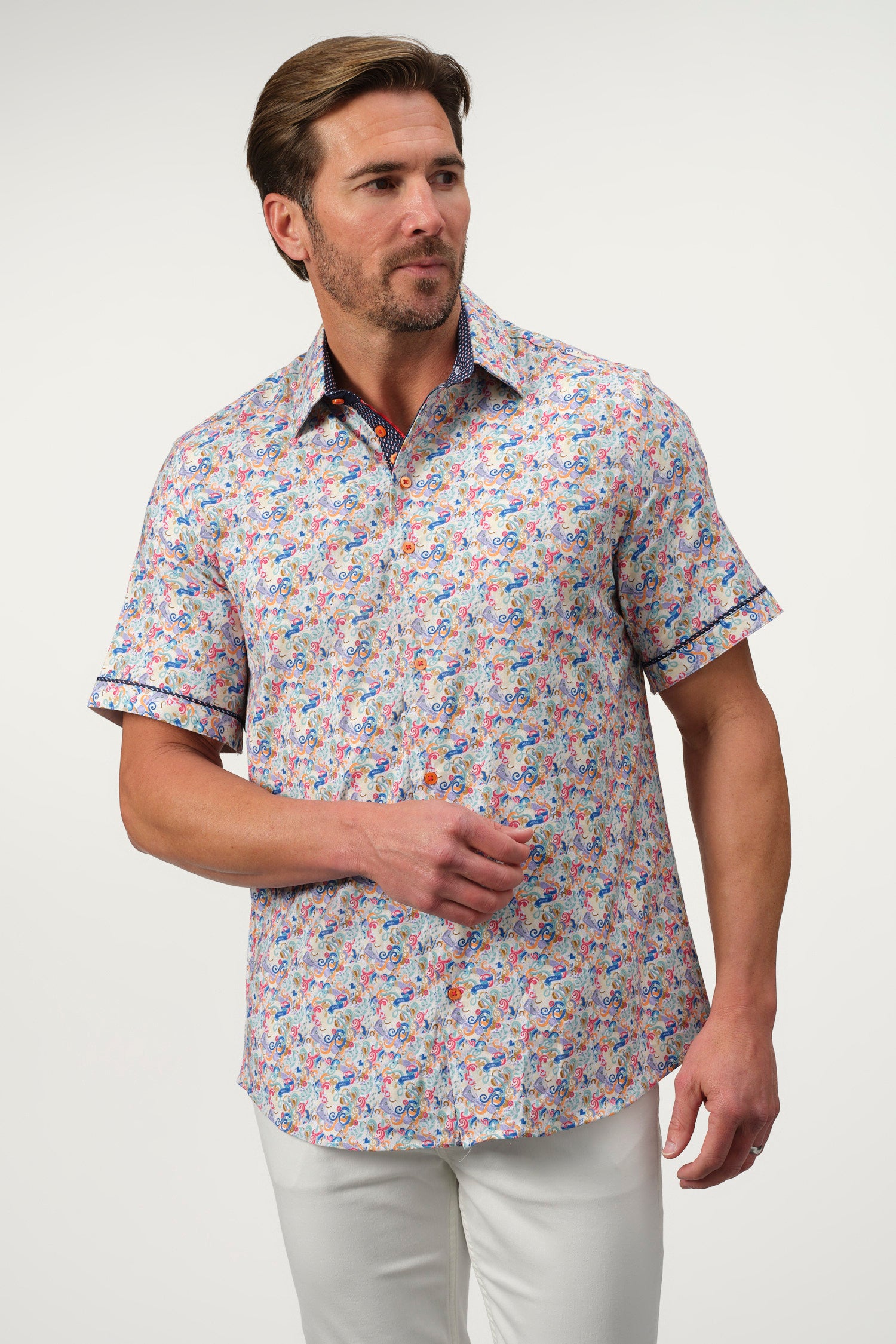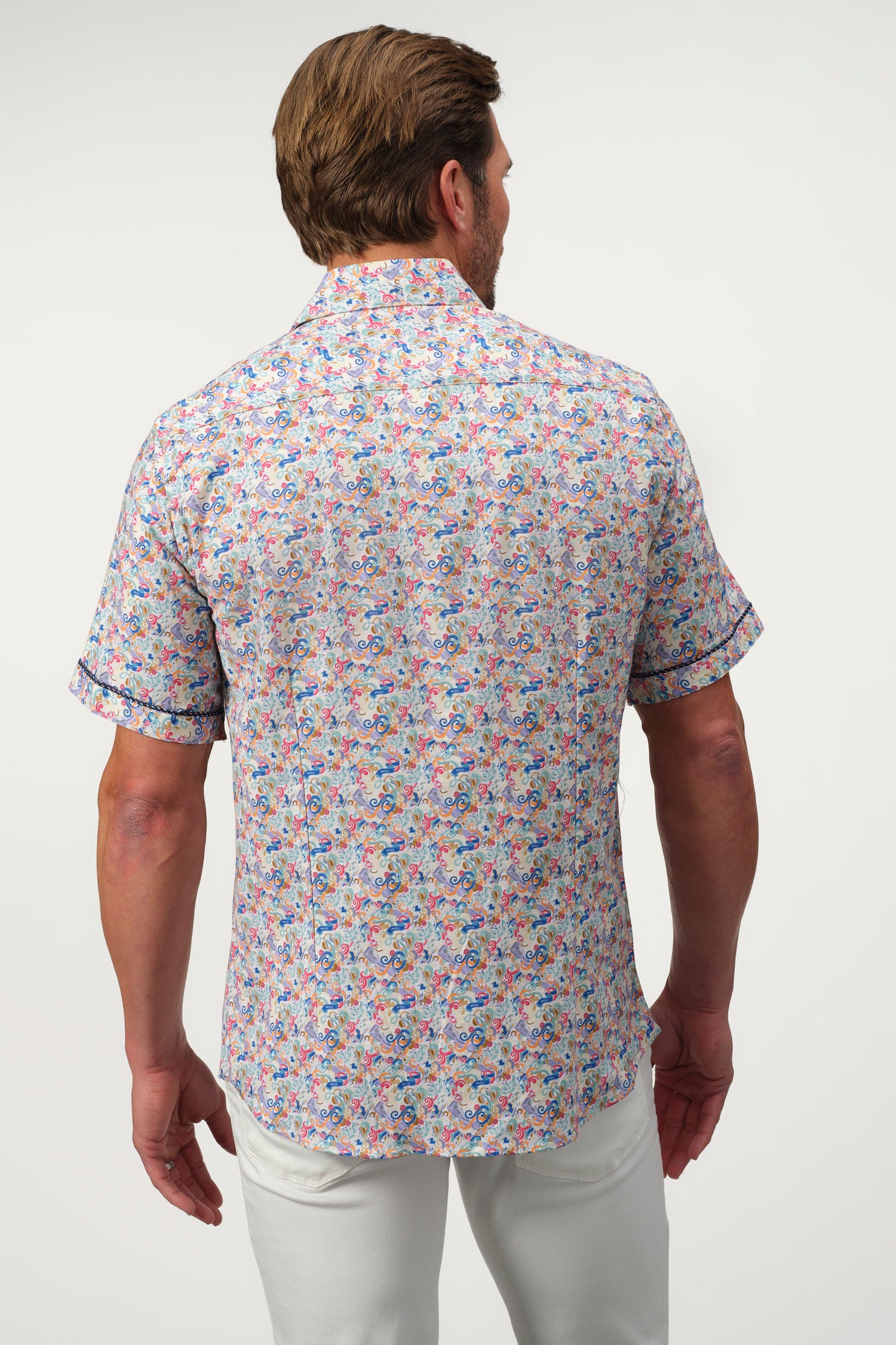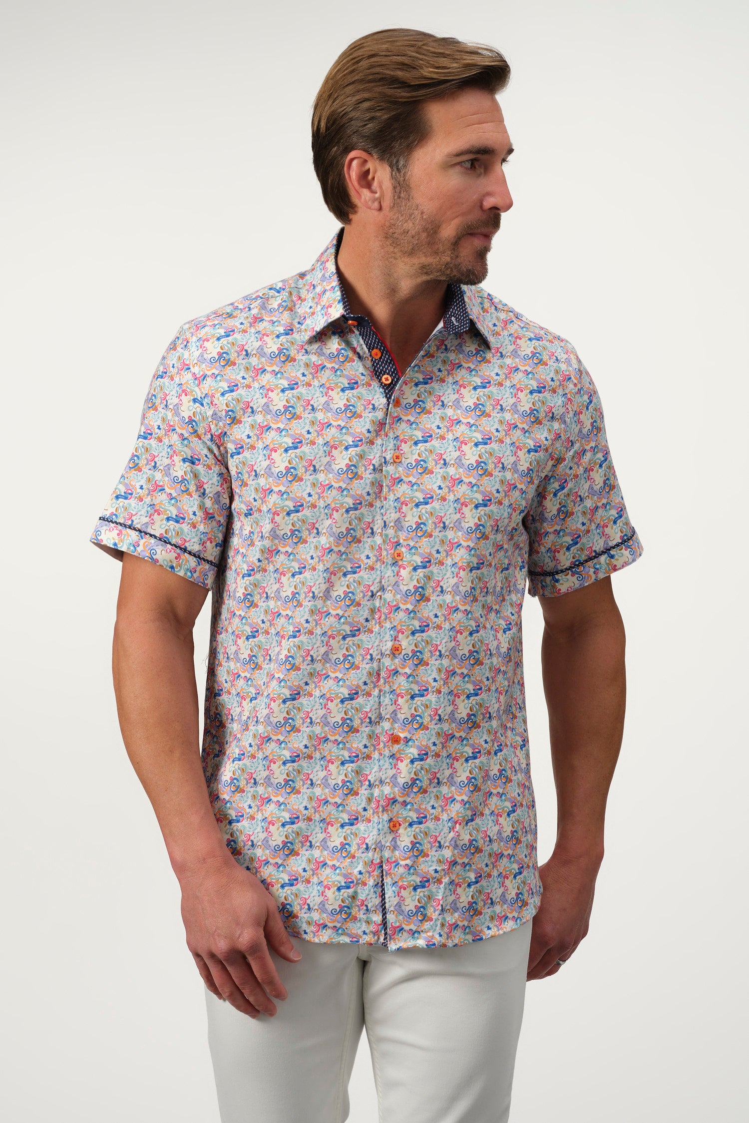A sophisticated fusion of intricate artistry and modern tailoring, the Baroque Scroll Shirt is a statement piece for the refined wardrobe. Designed with an elaborate scroll pattern in vibrant hues, this short-sleeve button-up is crafted from a soft offering both comfort and slight stretch for ease of movement. The contrasting inner collar and cuff details add an extra layer of elegance, making it perfect for smart-casual occasions.