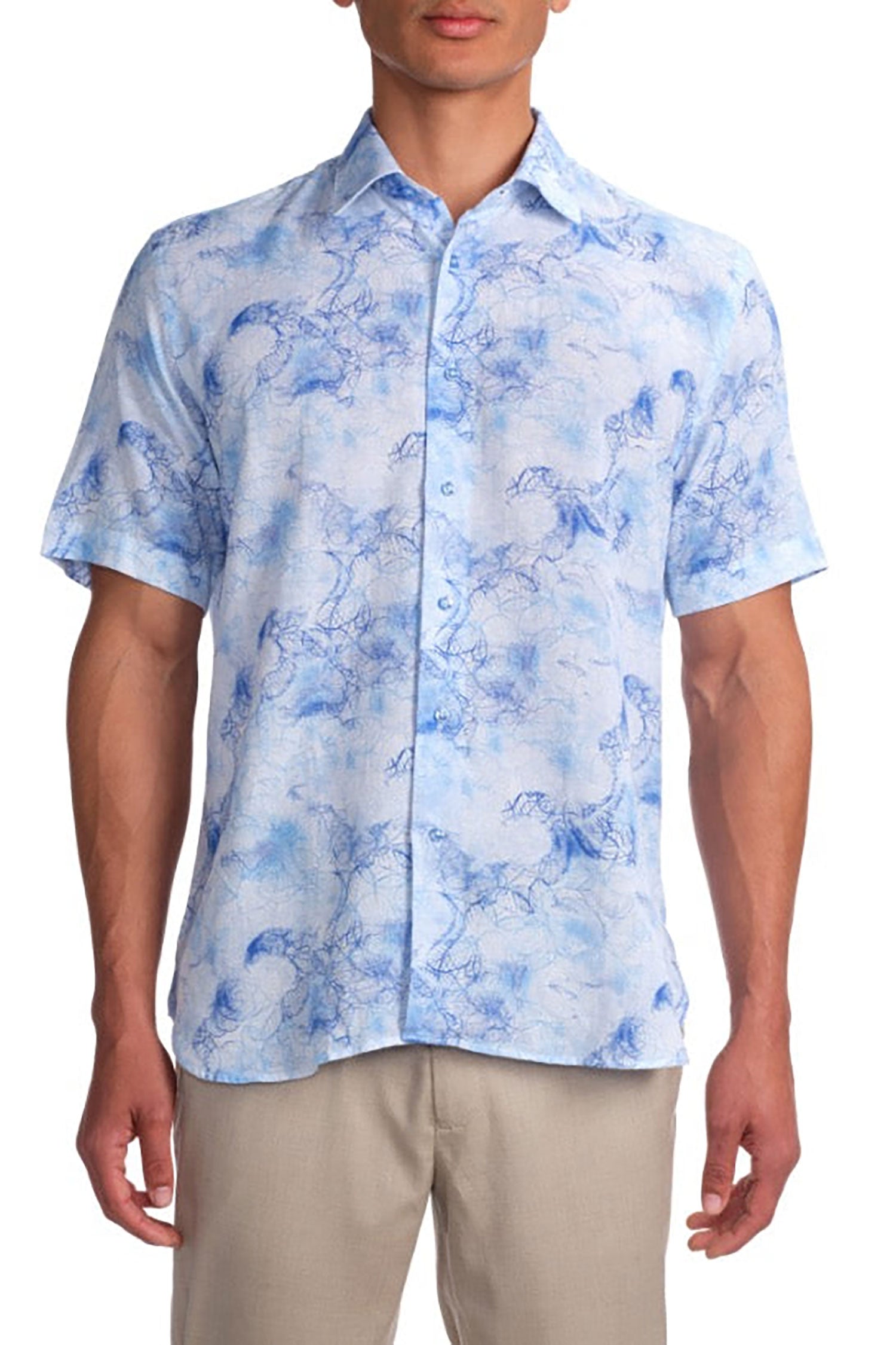 Featuring a unique print, this men's short sleeve shirt from Garnet Clothiers is adorned with a floral and abstract design. Its spread collar and front button fastenings add stylish and functional touches to this garment.