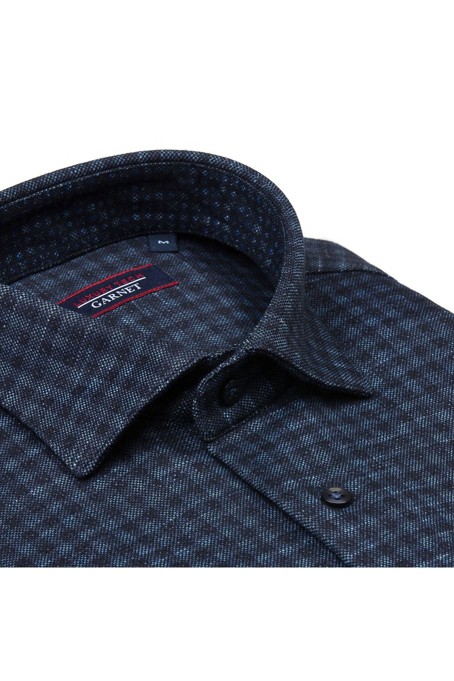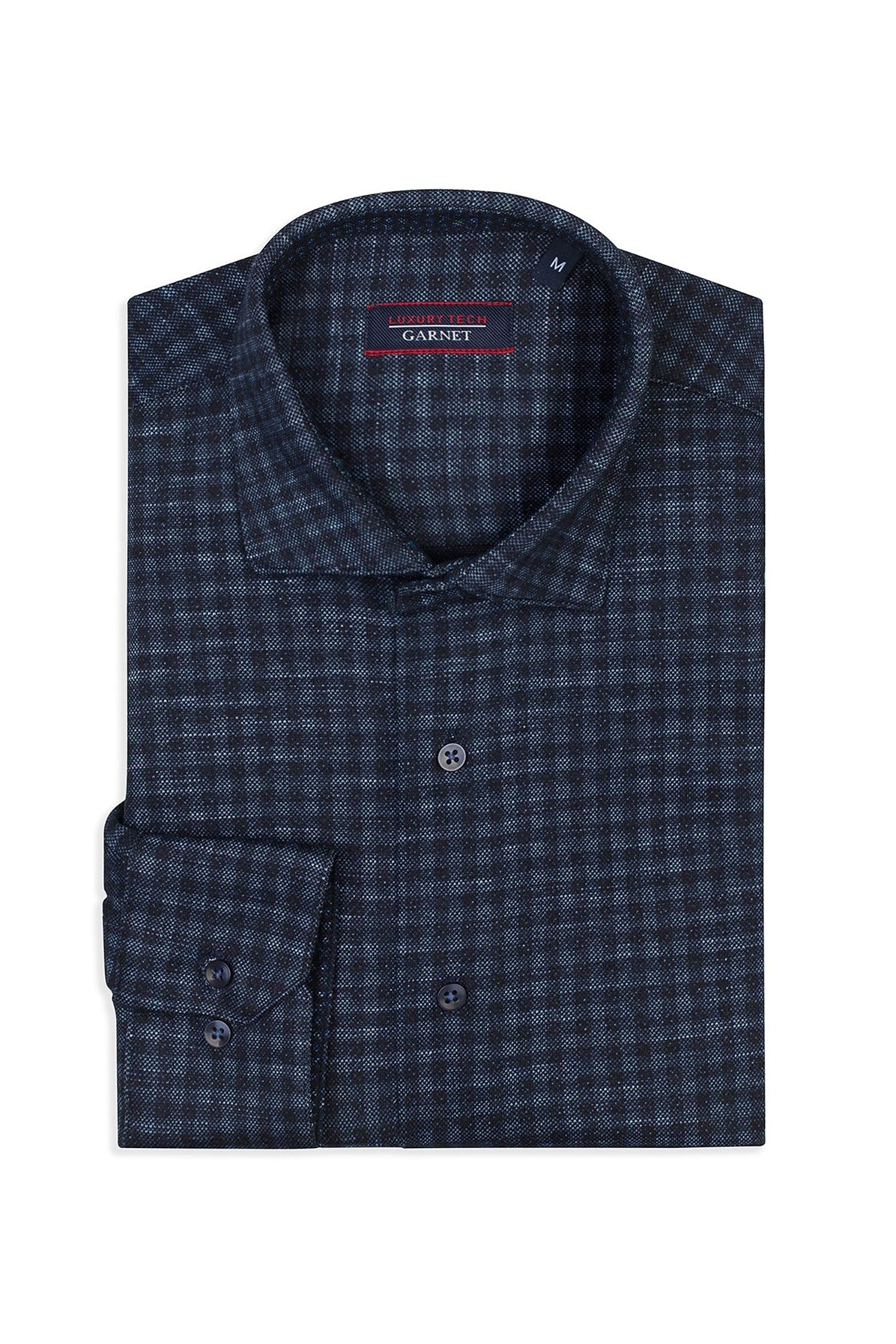 Garnet men's checkered navy knit long sleeve shirt is a cutting-edge shirt made with fascinating print. Each design is printed on cotton fabric with included stretch for additional comfort. This long-sleeve geometric print shirt is perfect for layering or wearing as-is and is done with noticeable detailing.