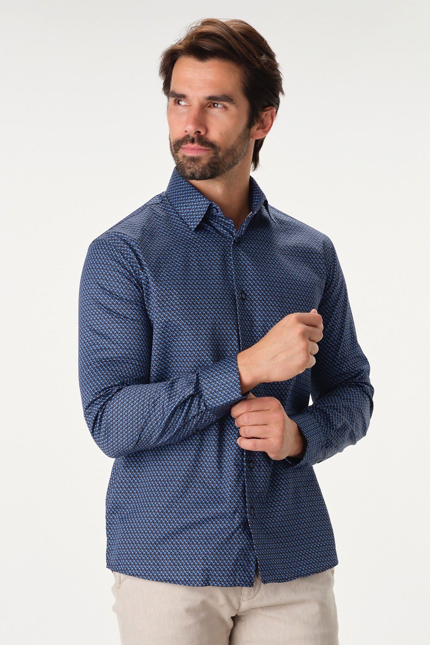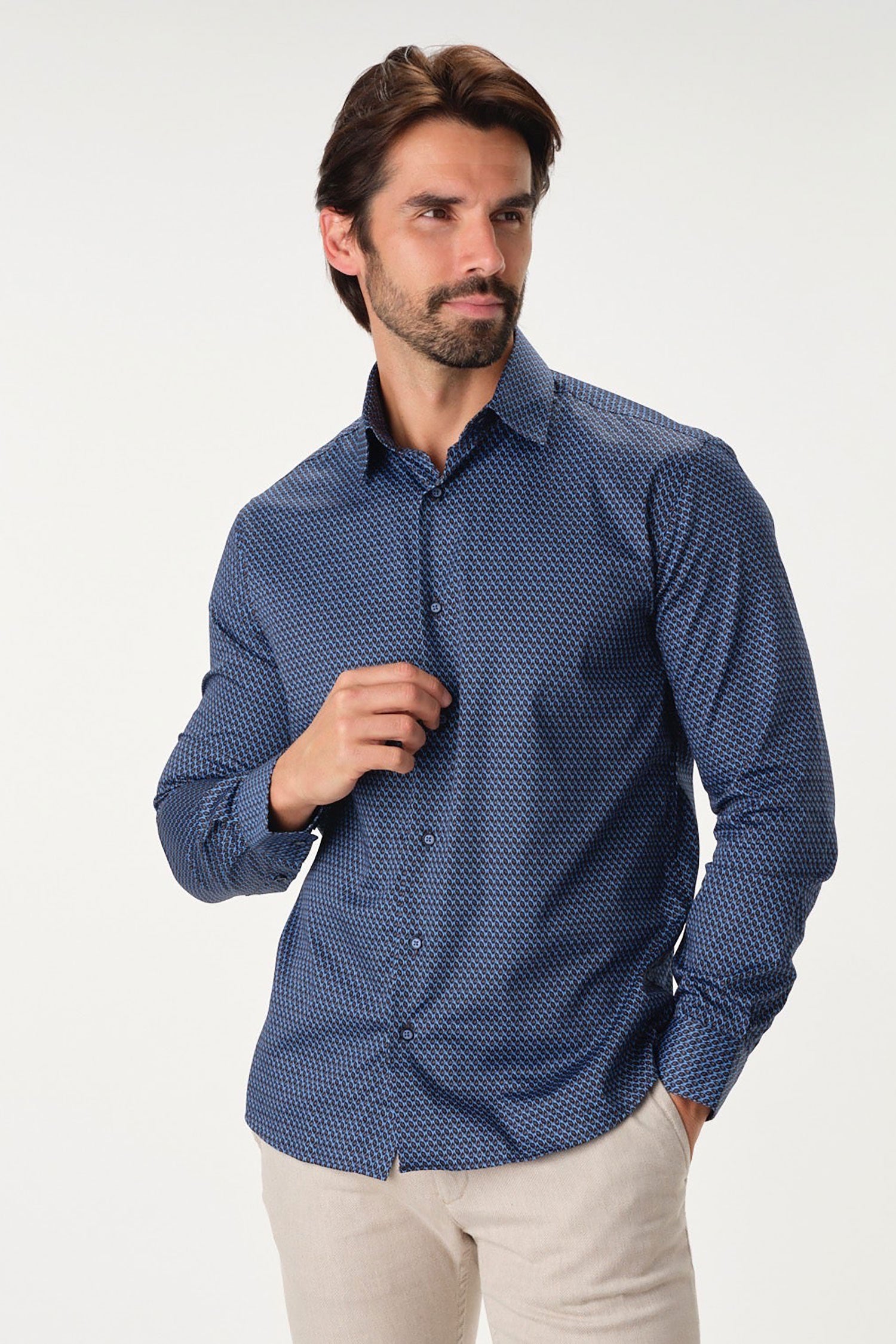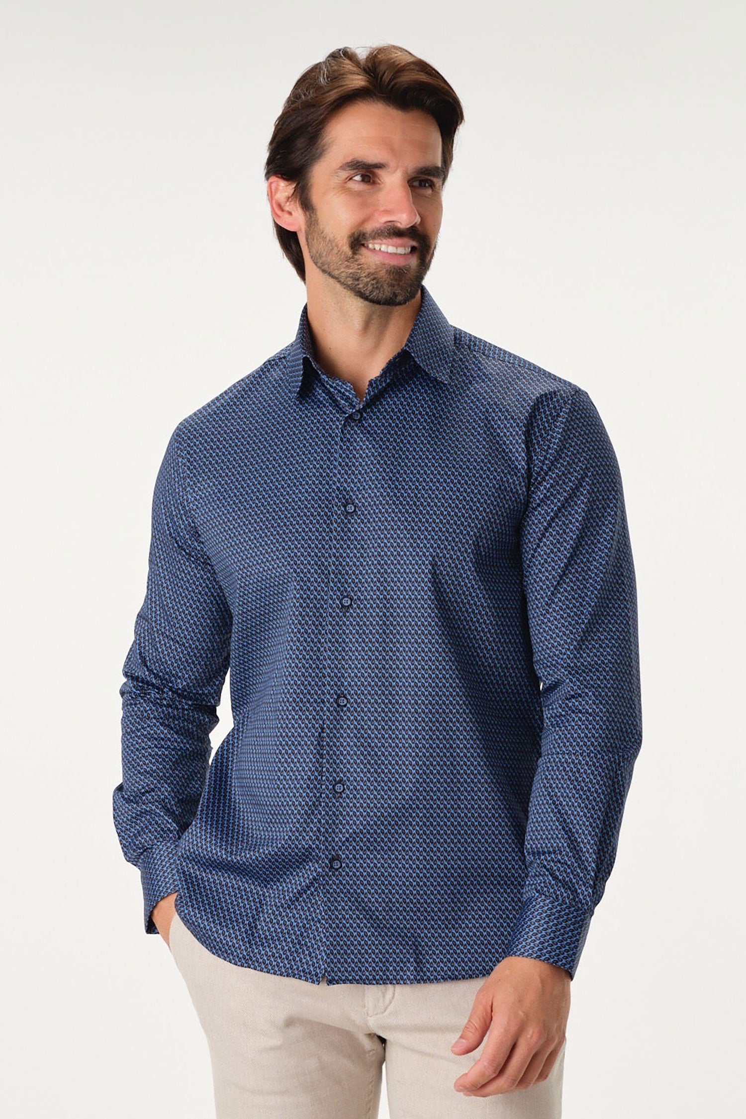 Diamond design navy long sleeve cotton shirt is a cutting-edge shirt made with fascinating print. Each design is printed on cotton fabric with included stretch for additional comfort. This long-sleeve print shirt is perfect for layering or wearing as-is and is done with noticeable detailing.