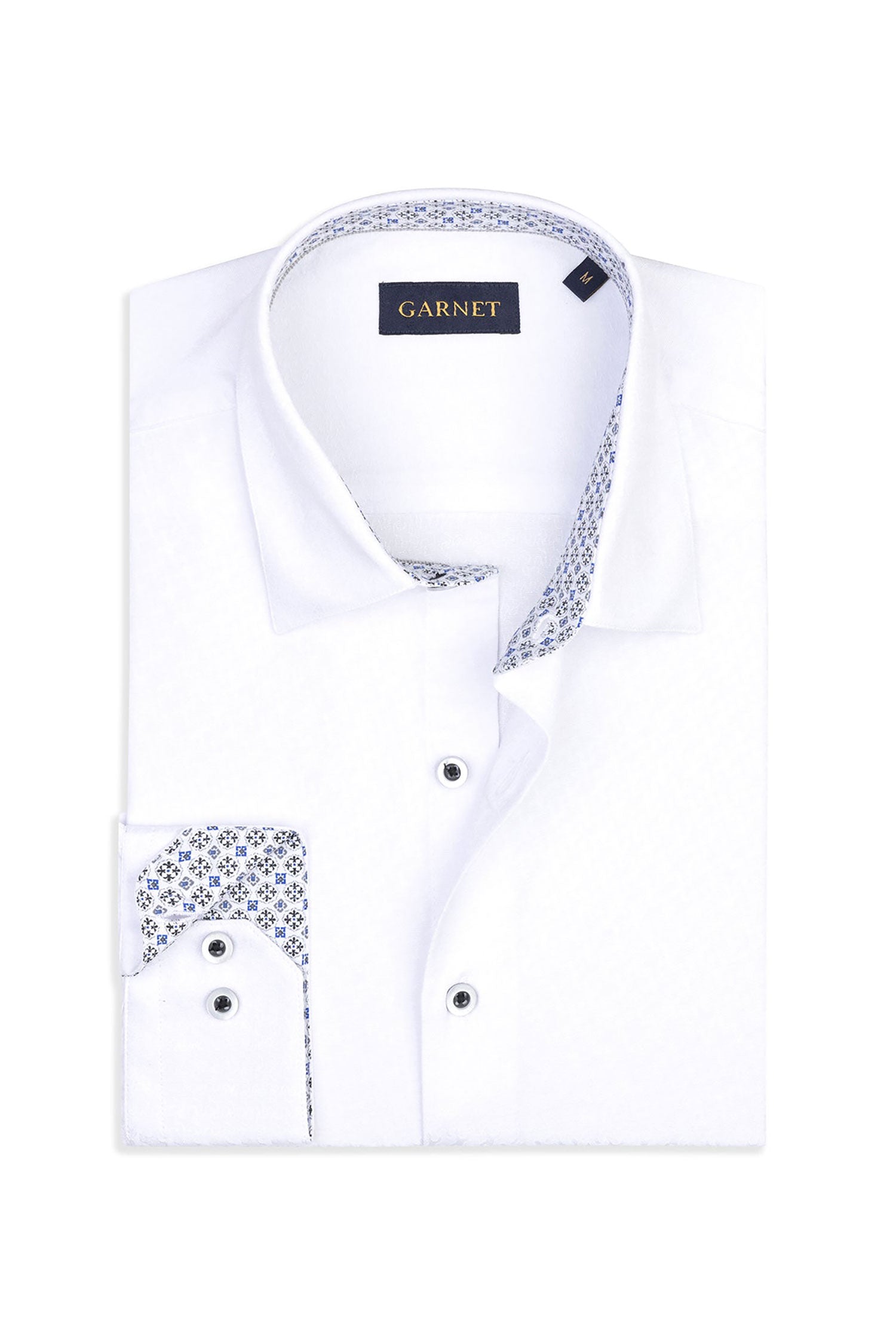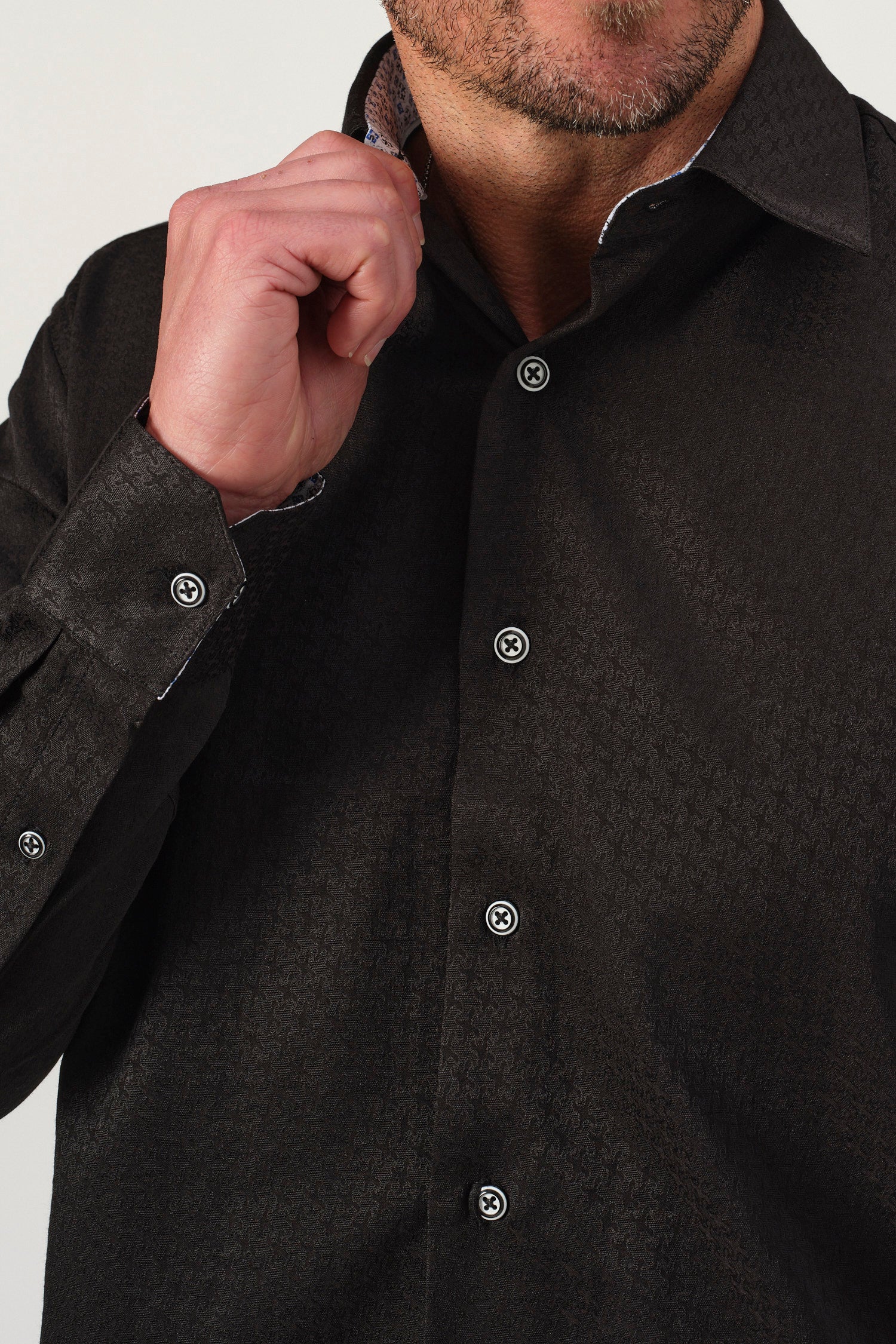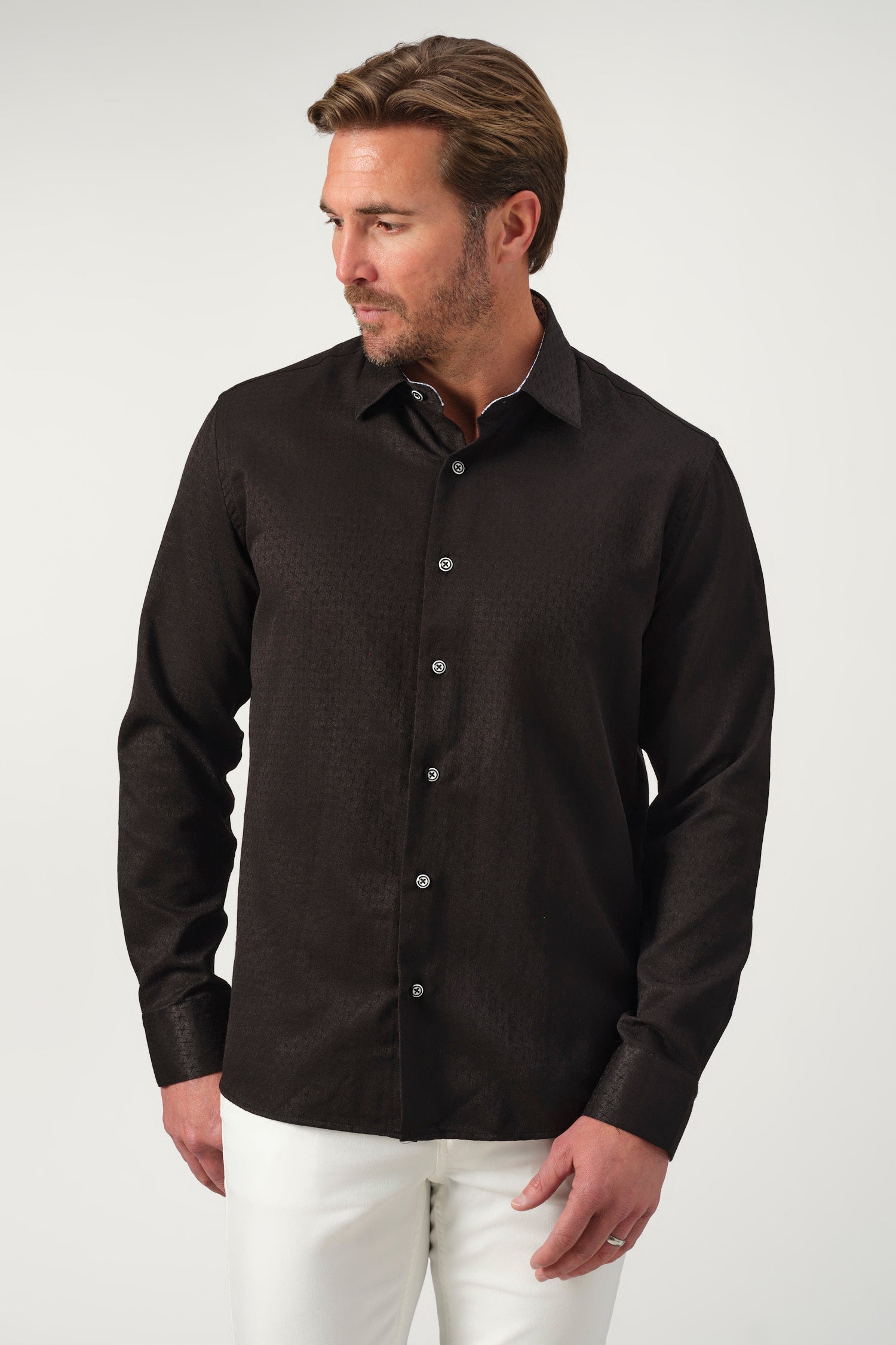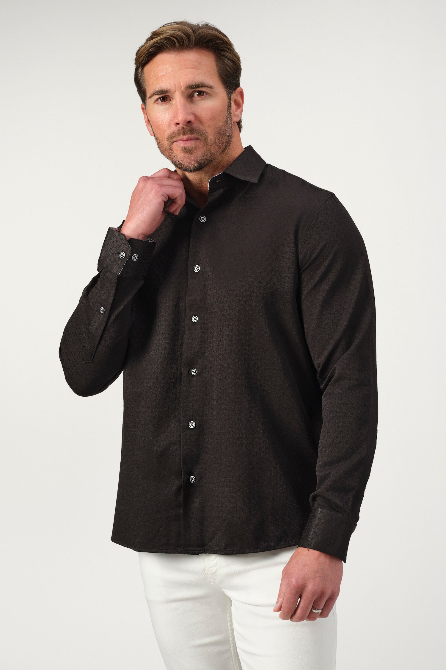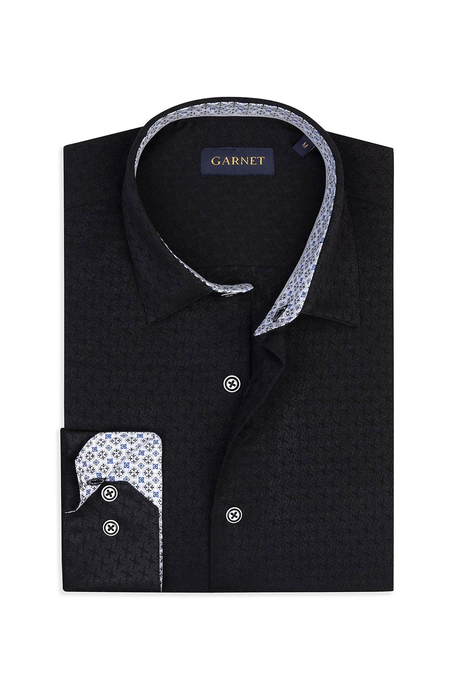 Experience elegance with the Garnet men's Minimal Jacquard Shirt. Featuring a black-on-black spiral jacquard pattern, this shirt exudes sophistication and modernity. Its premium fabric offers a comfortable and tailored fit, making it suitable for both formal events and stylish everyday wear. Elevate your wardrobe with this timeless piece that seamlessly blends classic and contemporary styles.