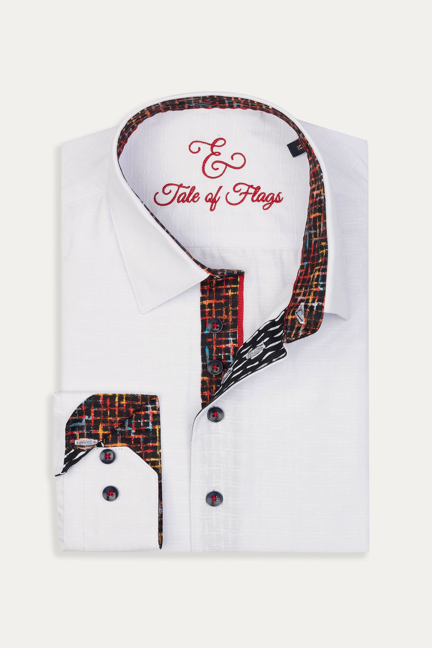 - Contrast inner collar, placket, and cuff design