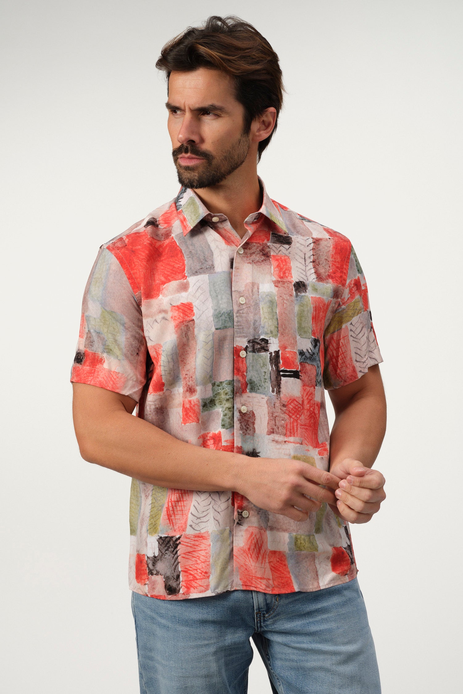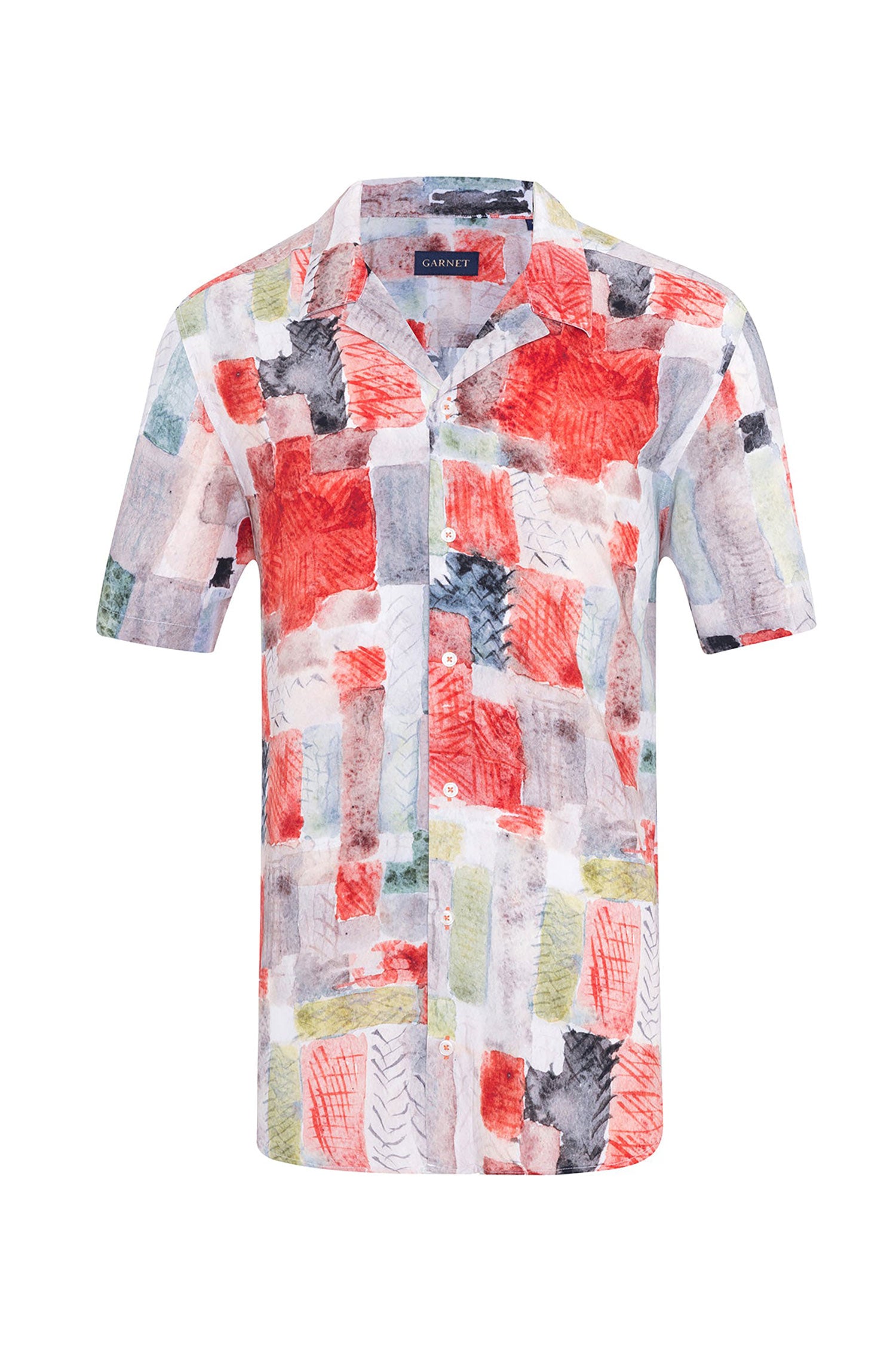 This luxury short sleeve shirt features an intricate abstract paint design, crafted with premium quality viscose fabric. With its full button closure and durable, breathable, and easy-care construction, this shirt is the epitome of elegance.