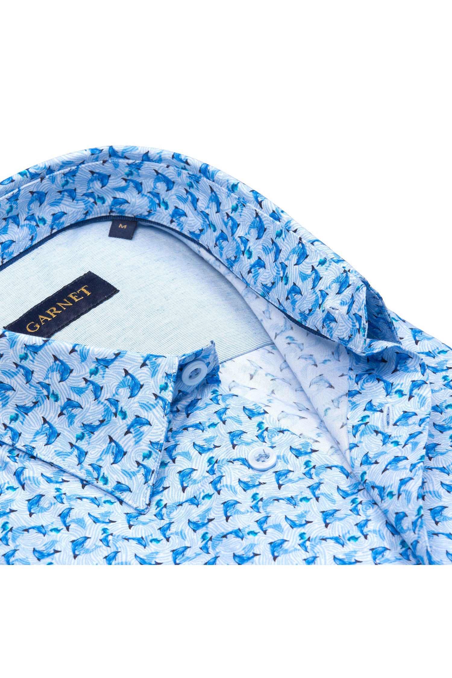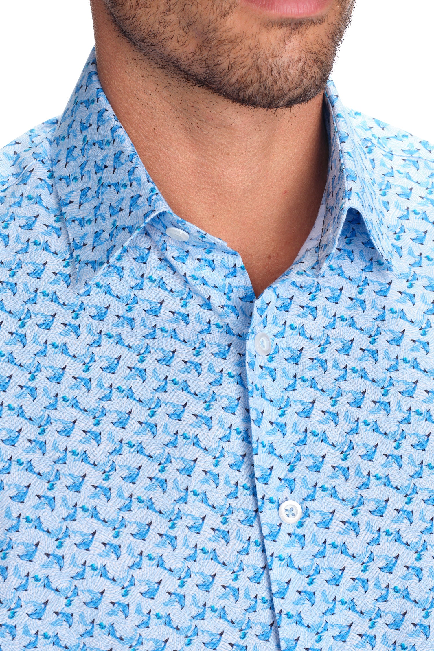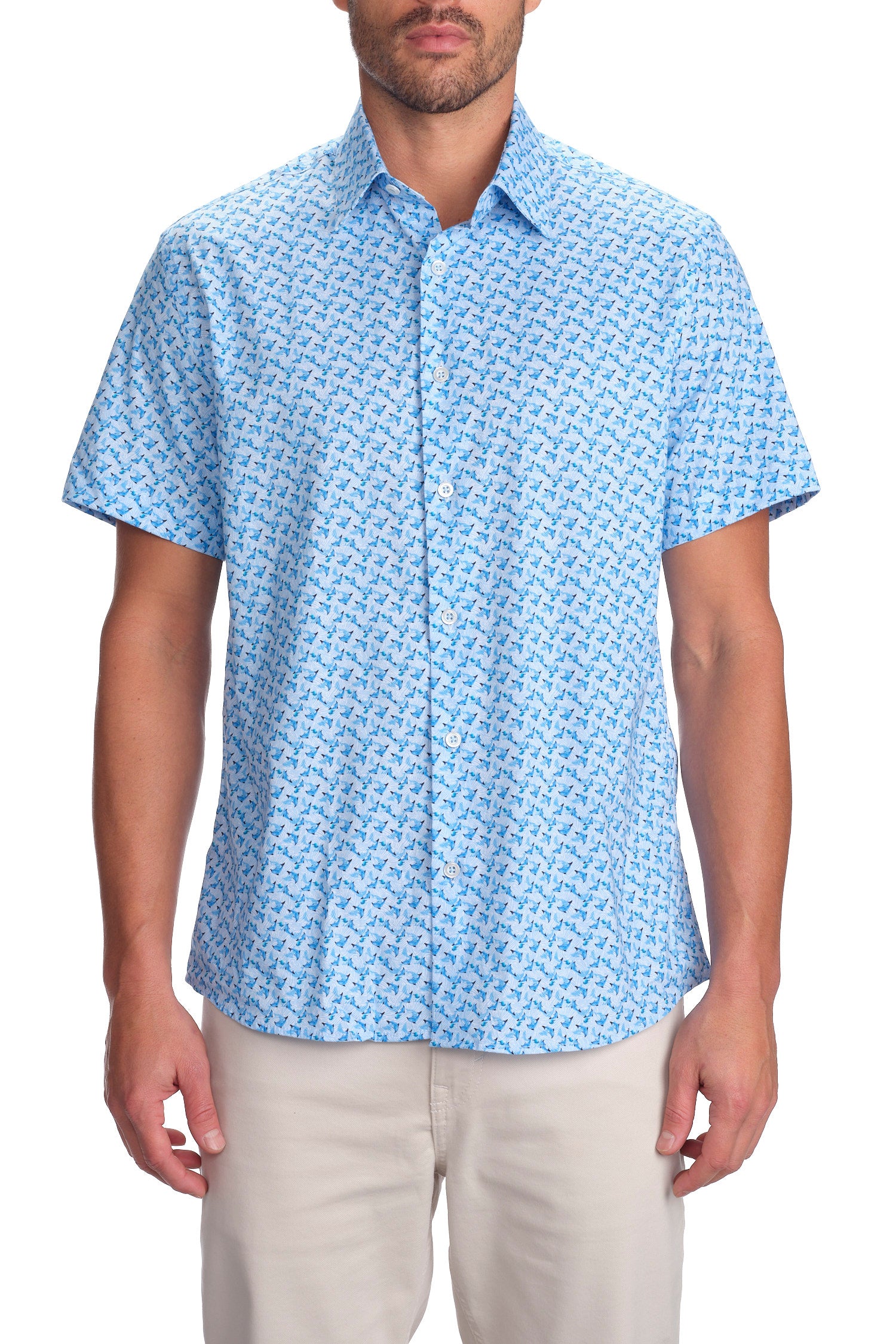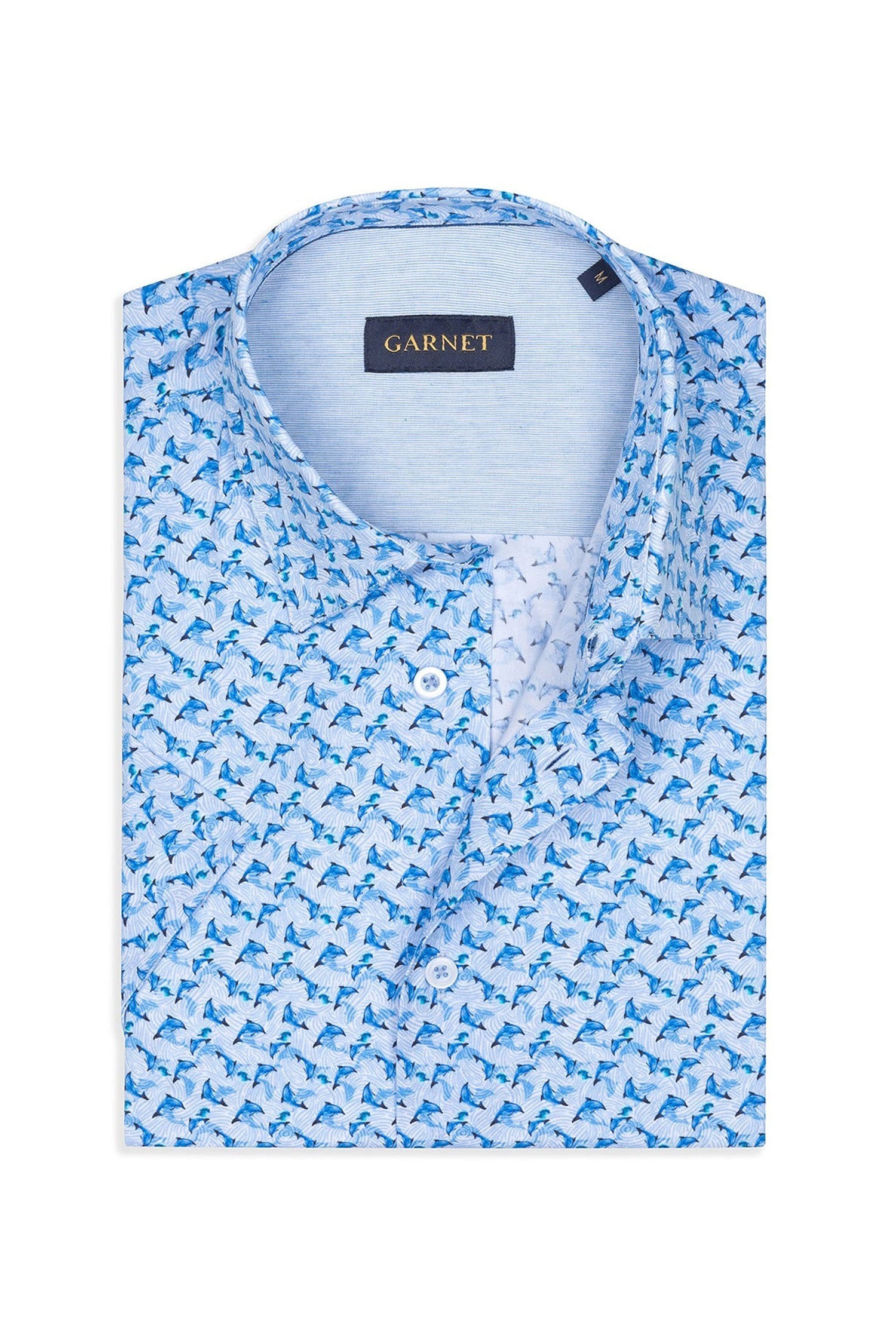 Make a splash with this dolphin printed short sleeve shirt. Perfect for beach trips and casual outings, this shirt will have you standing out in a sea of boring outfits. Dive in to style and make a statement with this unique and playful shirt.