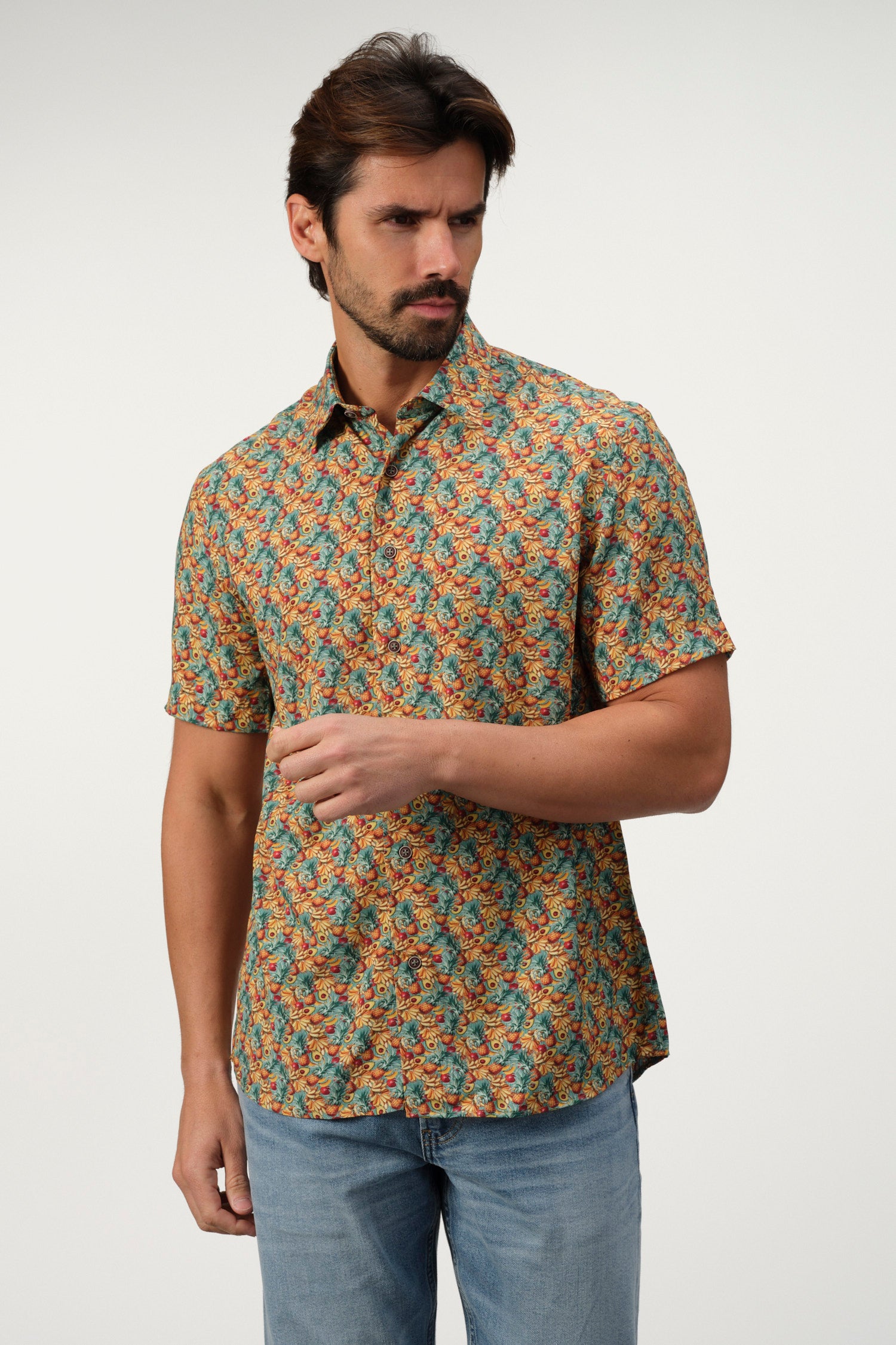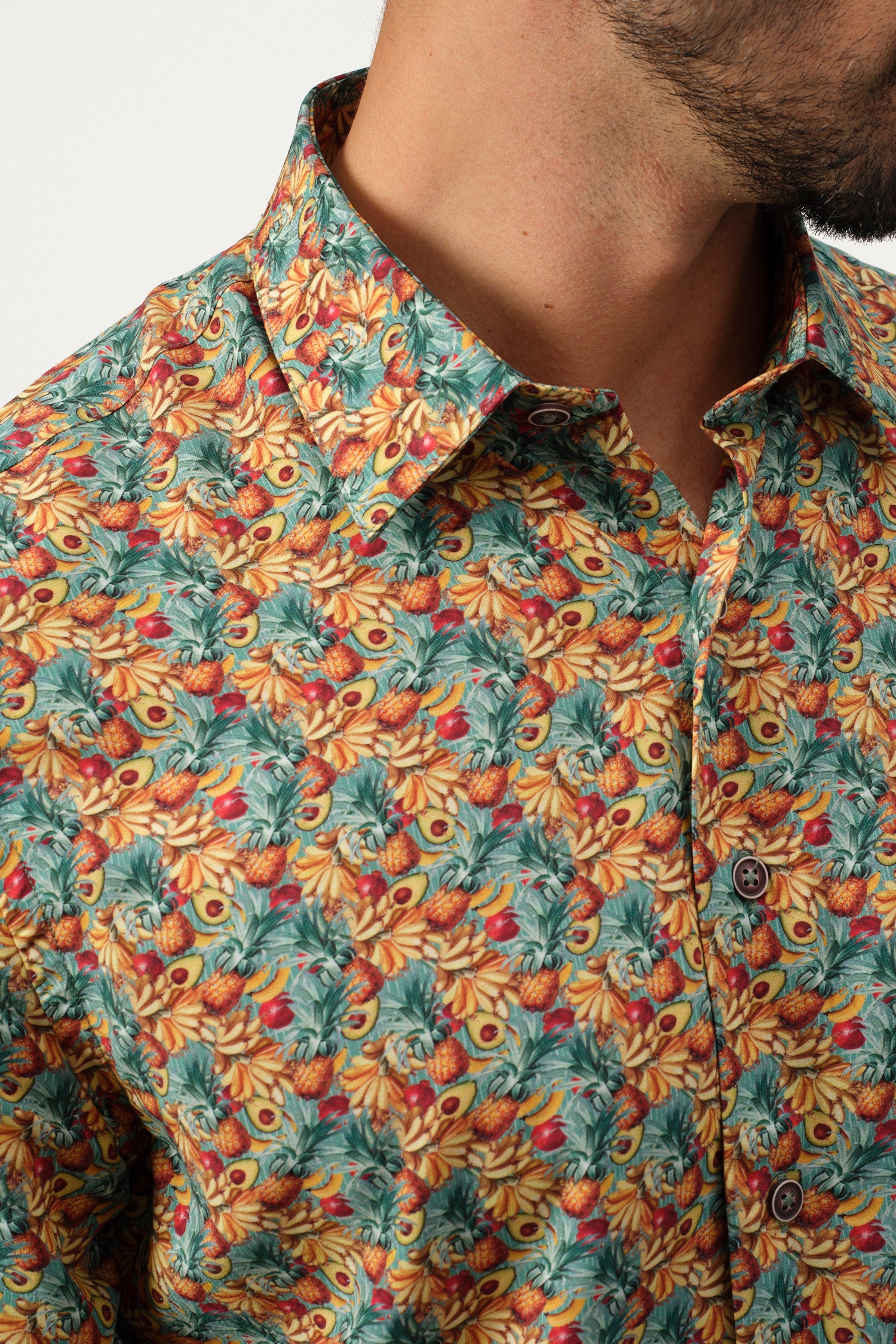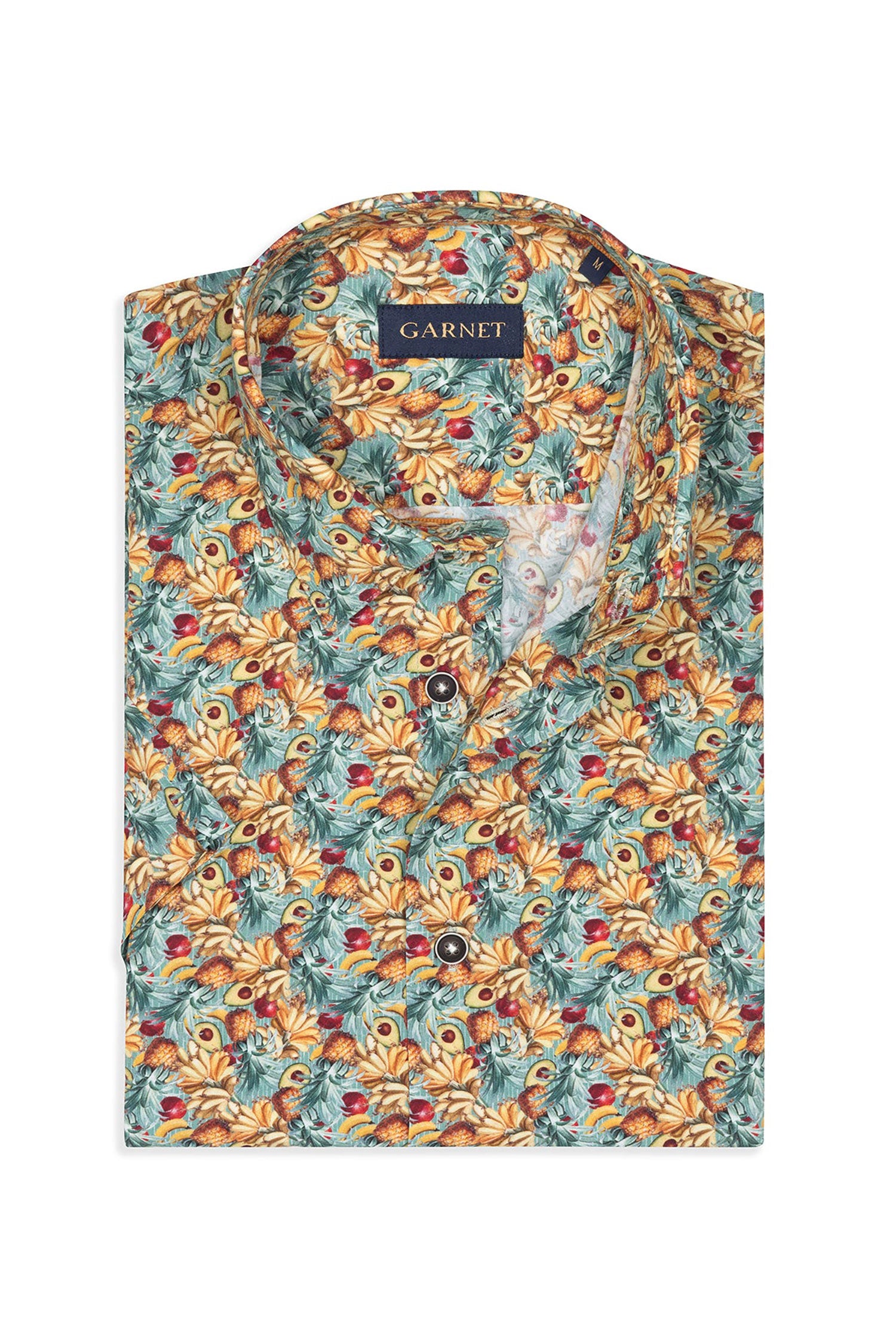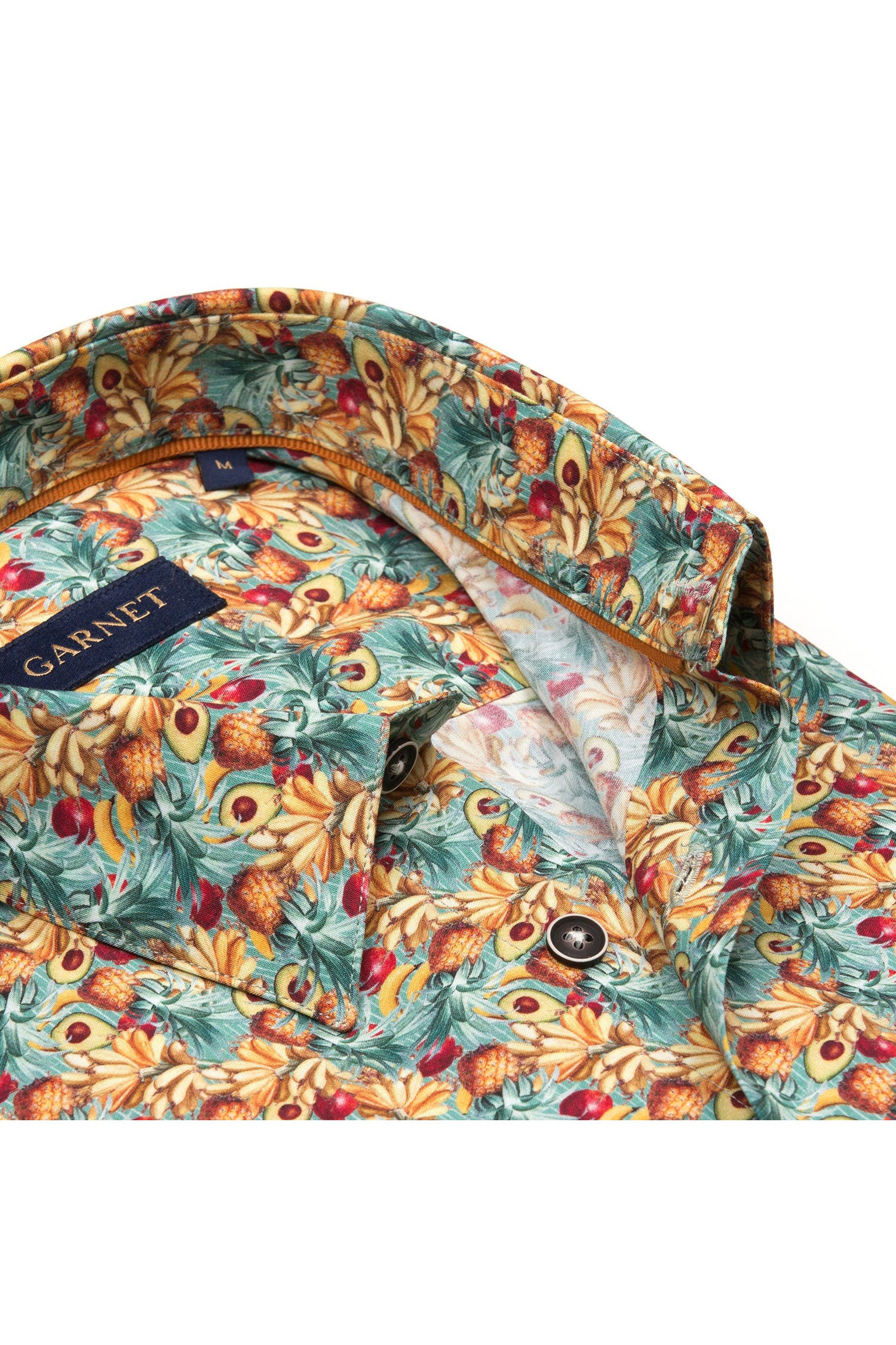 Expertly crafted with a spread collar and front button fastenings, this long sleeve shirt boasts a unique print featuring tropical fruits and floral designs. Made with high-quality, breathable fabric, it is a staple piece for any fashion-forward man looking to add a pop of color to his wardrobe. From the renowned Garnet brand, this button down shirt is a must-have for any professional wardrobe.