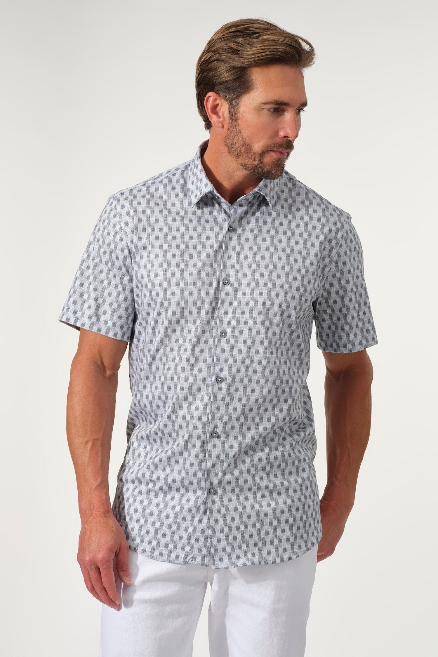 A modern take on timeless pattern, the Sienna Check Dynamic Comfort Shirt brings effortless versatility to your wardrobe. Designed with a clean short-sleeve silhouette, it features a tonal checkered print that adds just the right amount of visual texture. Crafted from a stretch cotton blend, it offers a breathable, flexible fit—perfect for warm days, weekend outings, or casual Fridays.