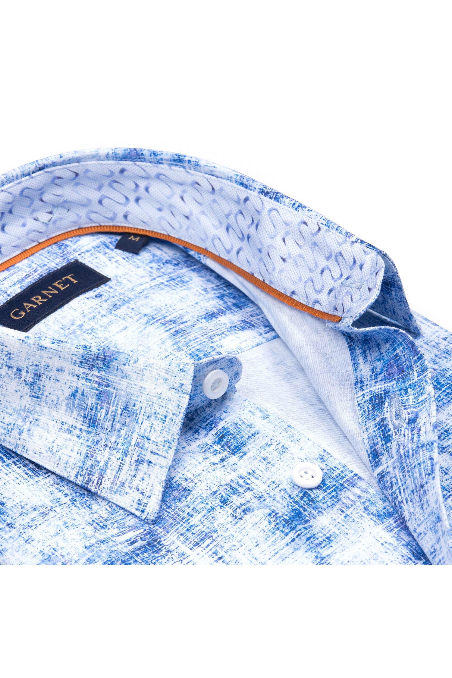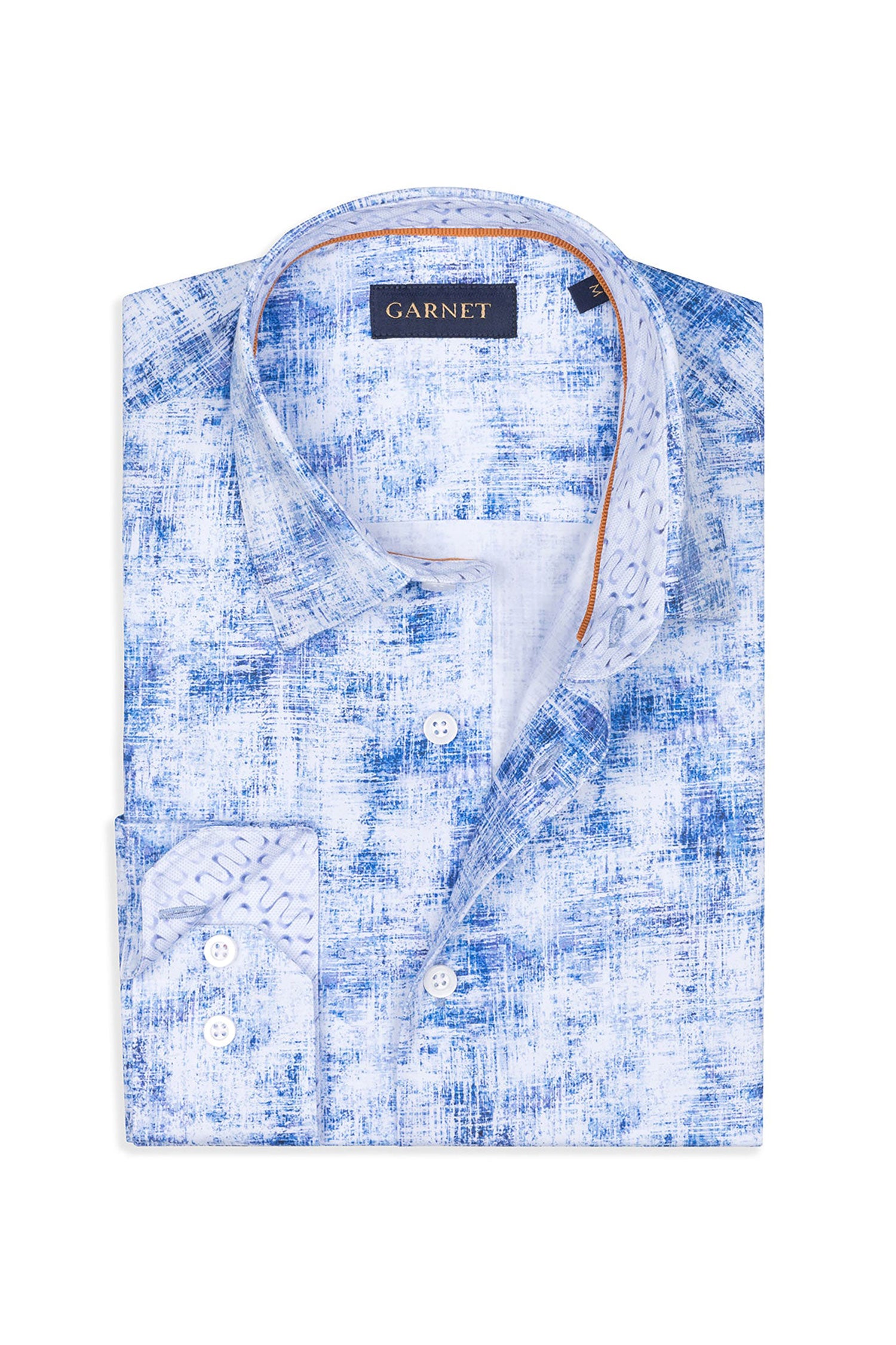 Shop our collection of premium printed shirts for sophisticated and versatile style. Choose from tropical or geometric patterns in soft, breathable fabrics for all-day comfort. Perfect for any occasion, elevate your wardrobe with our tailored fit, spread collar, long sleeve button down shirt from Garnet in blue.