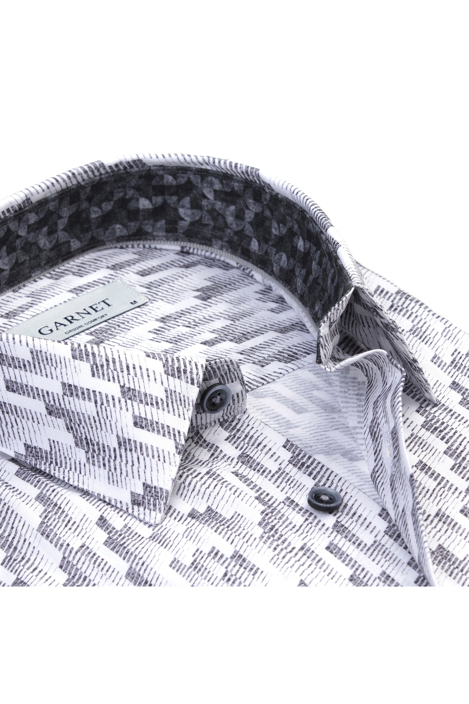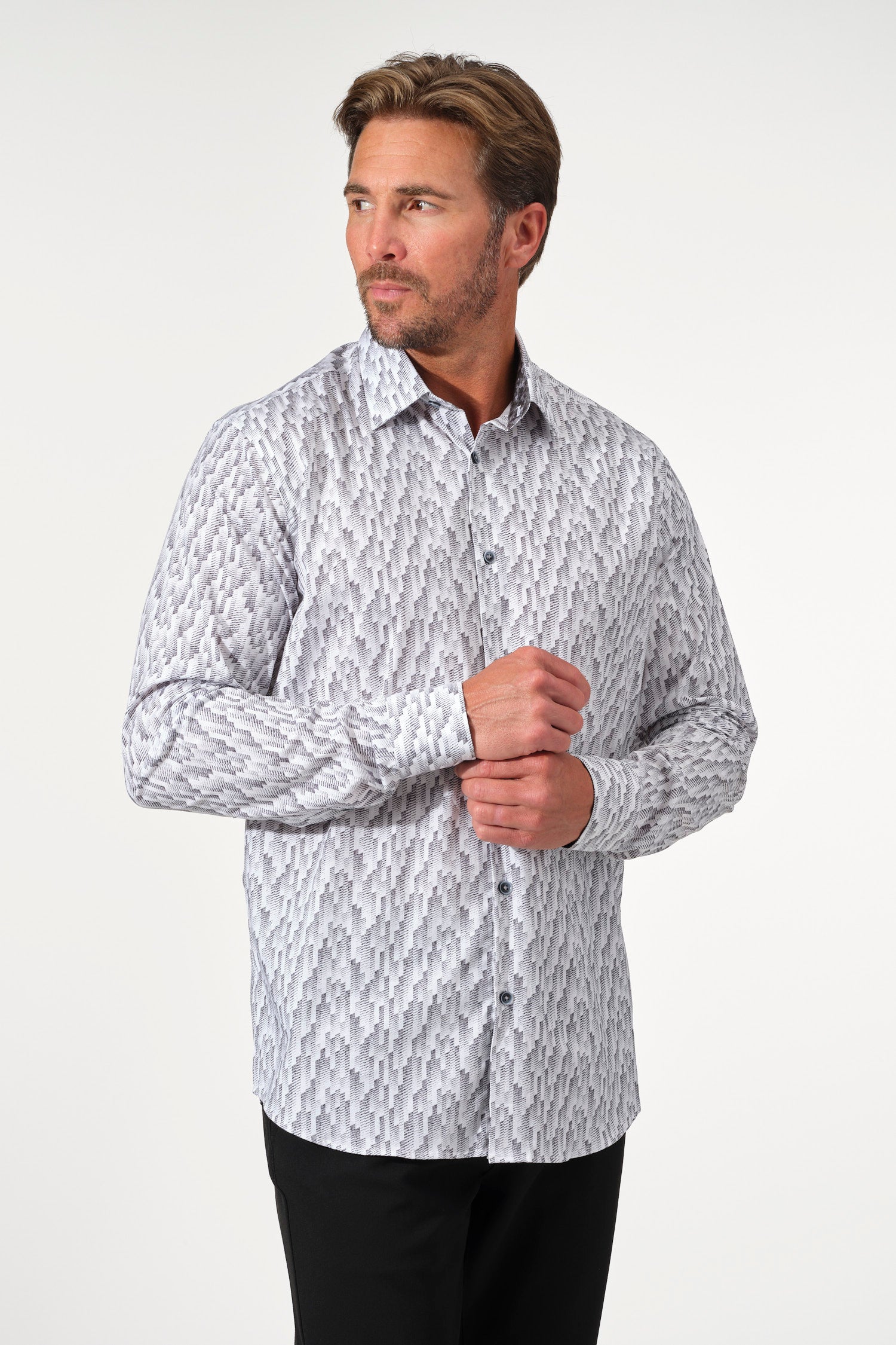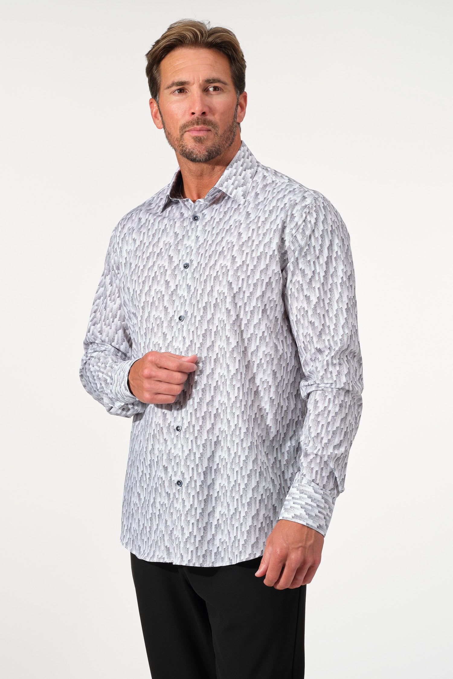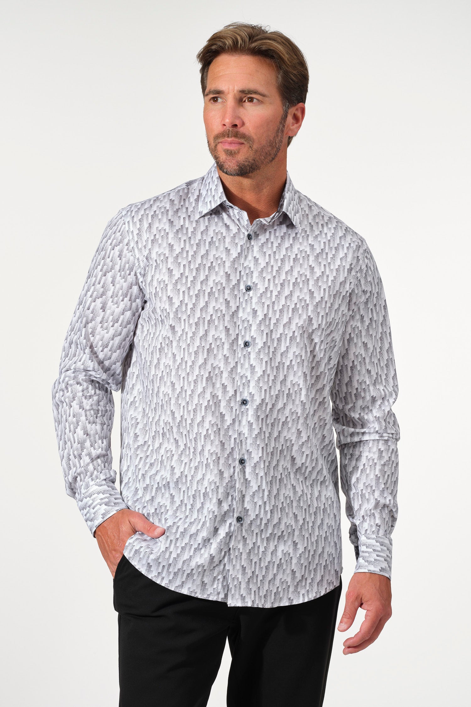 Step up your shirt game with this architectural-inspired pattern featuring a stepped linear design in crisp blue on white. Crafted from a soft stretch-cotton blend, this shirt delivers elevated comfort with subtle contrast accents that peek from the collar and cuffs. It's modern, refined, and ready for anything from workdays to weekends.