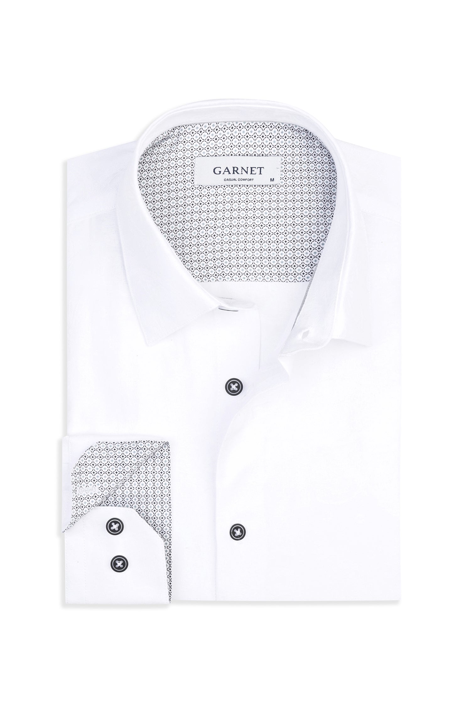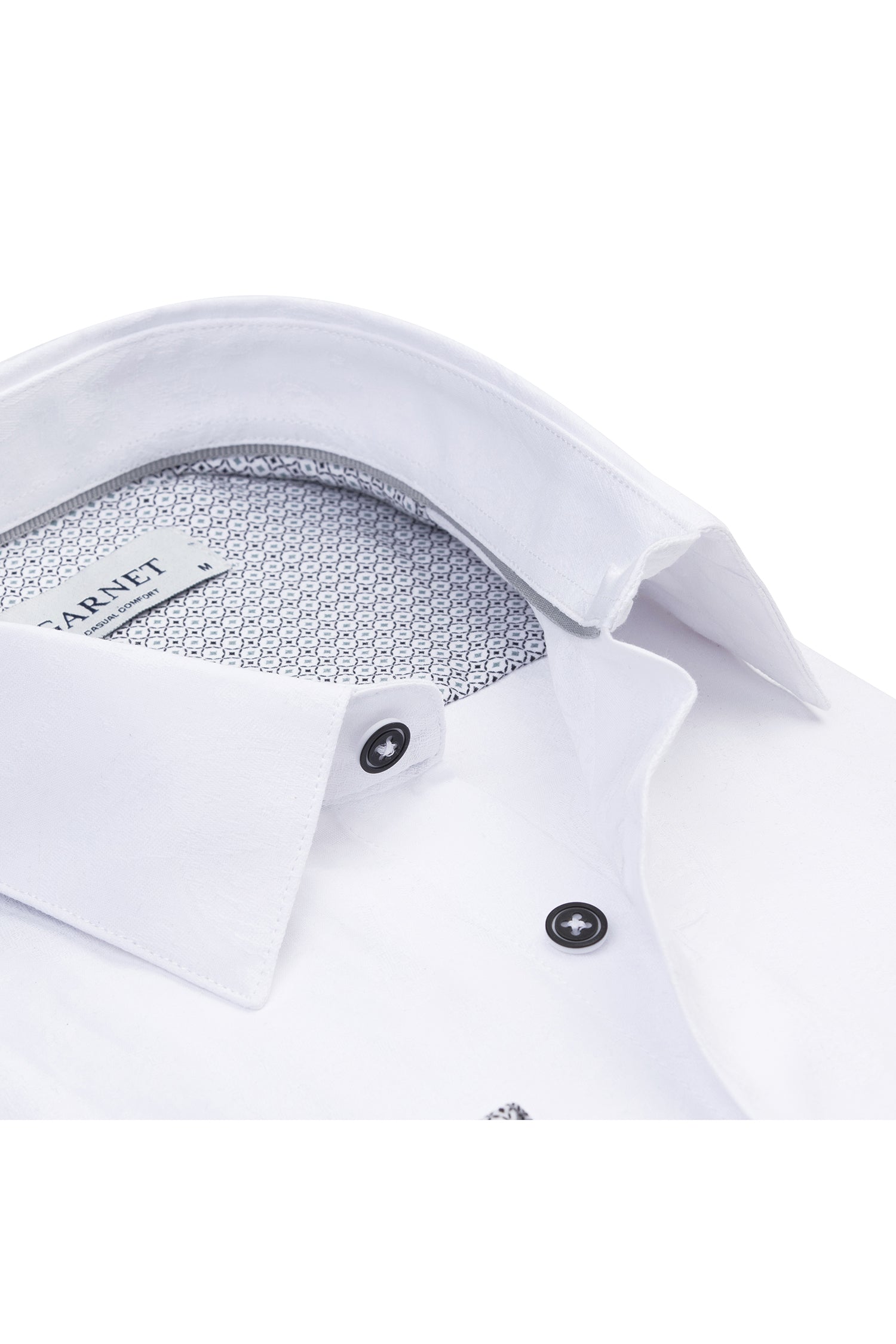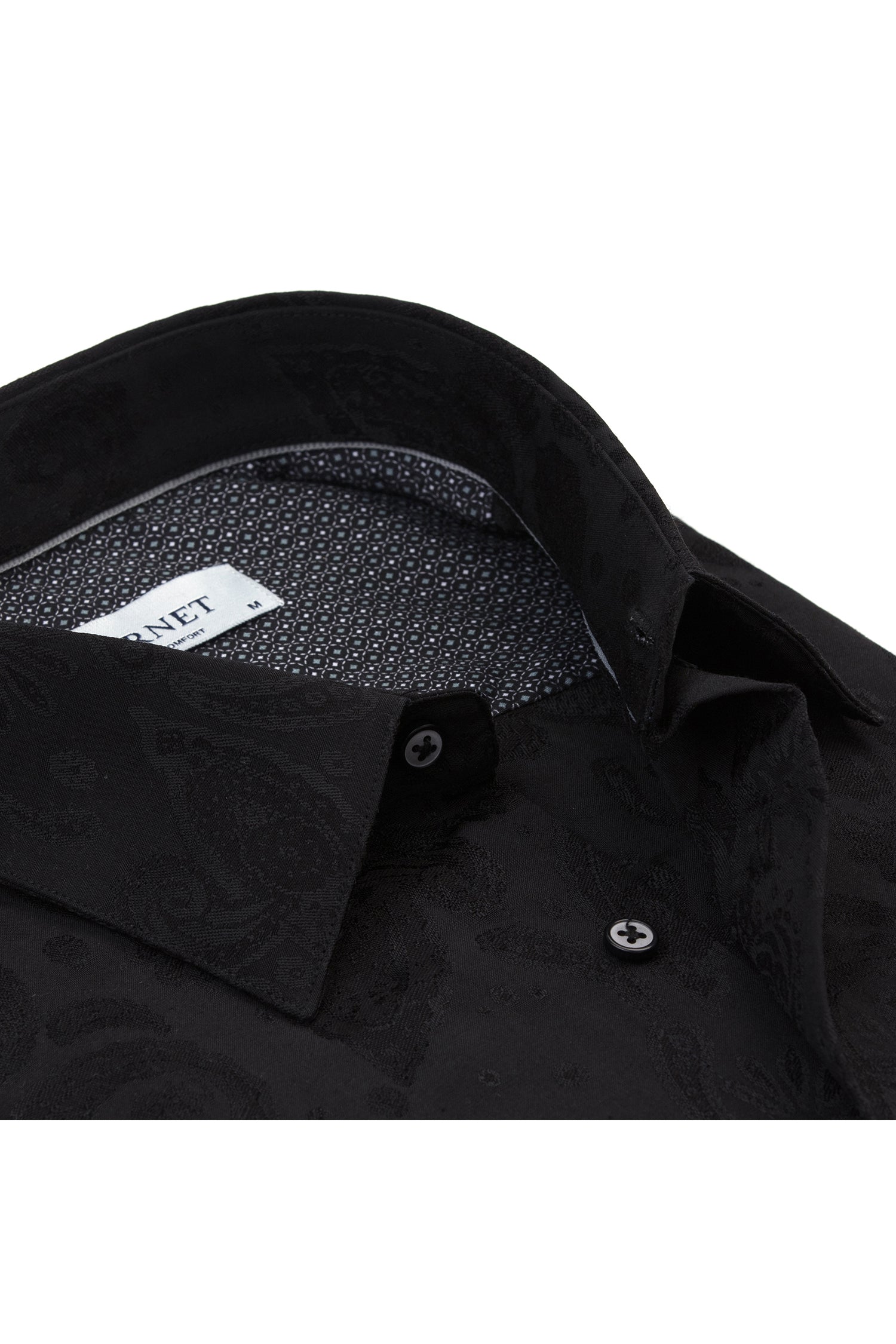 This jacquard shirt is a modern classic, woven with an elegant tonal paisley pattern that catches the light without overpowering the look. It’s subtle, rich in texture, and effortlessly versatile—from refined eveningwear to elevated day-to-night dressing. Inside, a contrast geometric trim at the collar and cuff adds a sharp finishing touch.